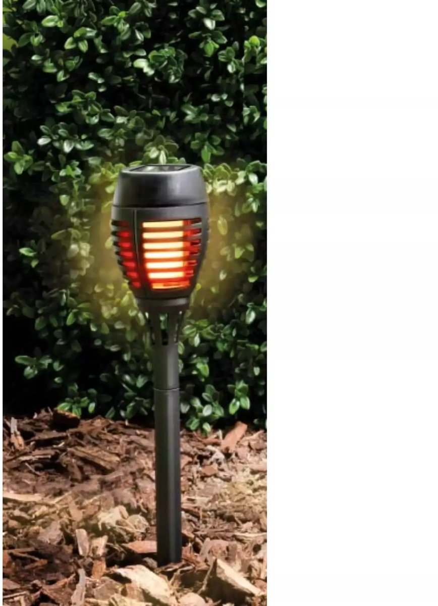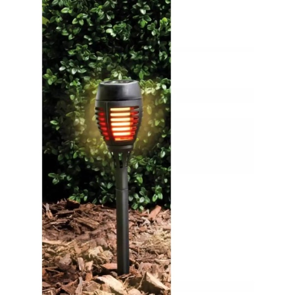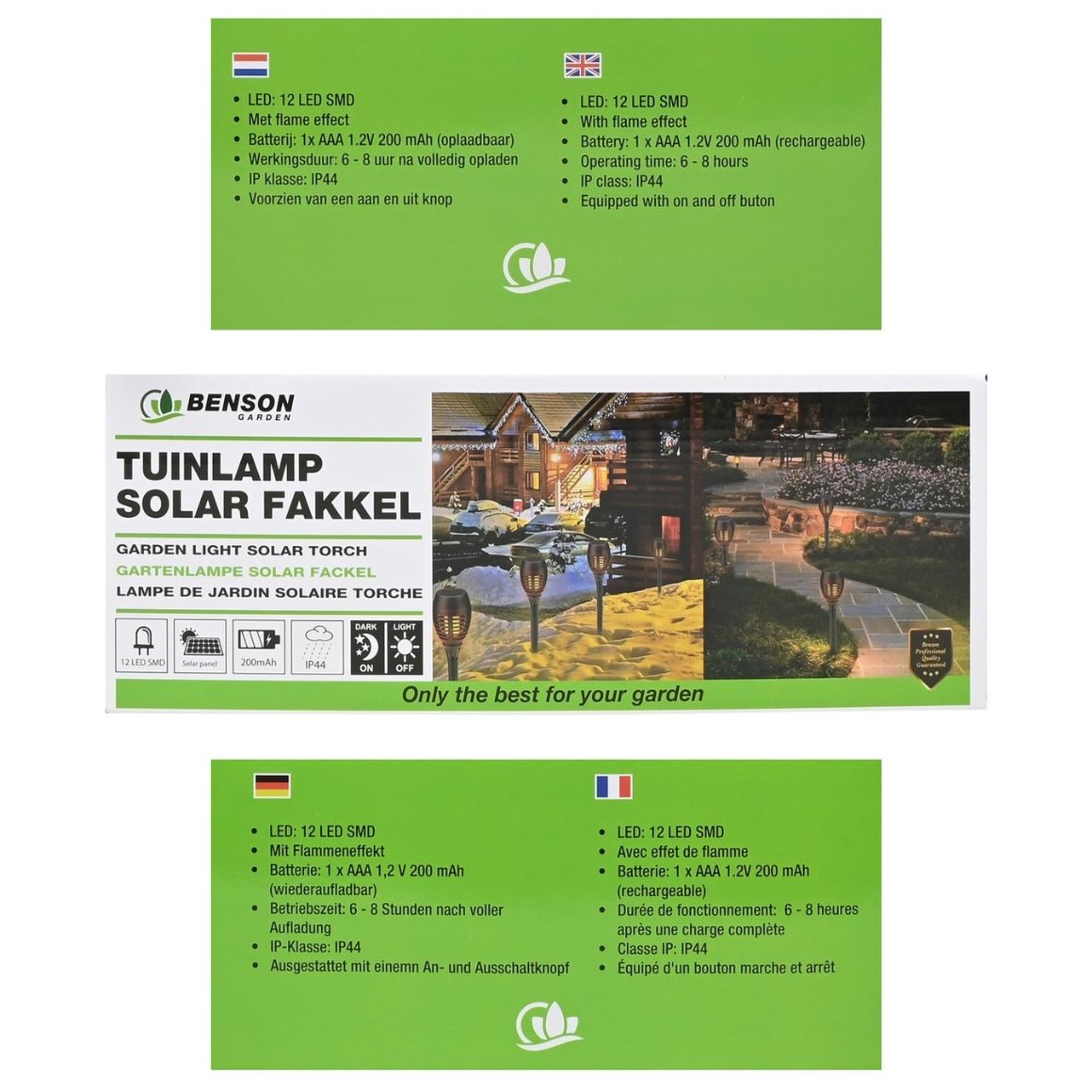 Deze Benson solar tuinlamp met fakkelontwerp zorgt voor een sfeervol vlameffect in de tuin. De 12 LED SMD-lampen geven een warme, flakkerende gloed en werken op zonne-energie. Met een volledig opgeladen batterij brandt de lamp 6-8 uur. De tuinlamp is voorzien van een aan/uit-knop en heeft een IP44-classificatie, wat hem geschikt maakt voor buitengebruik.