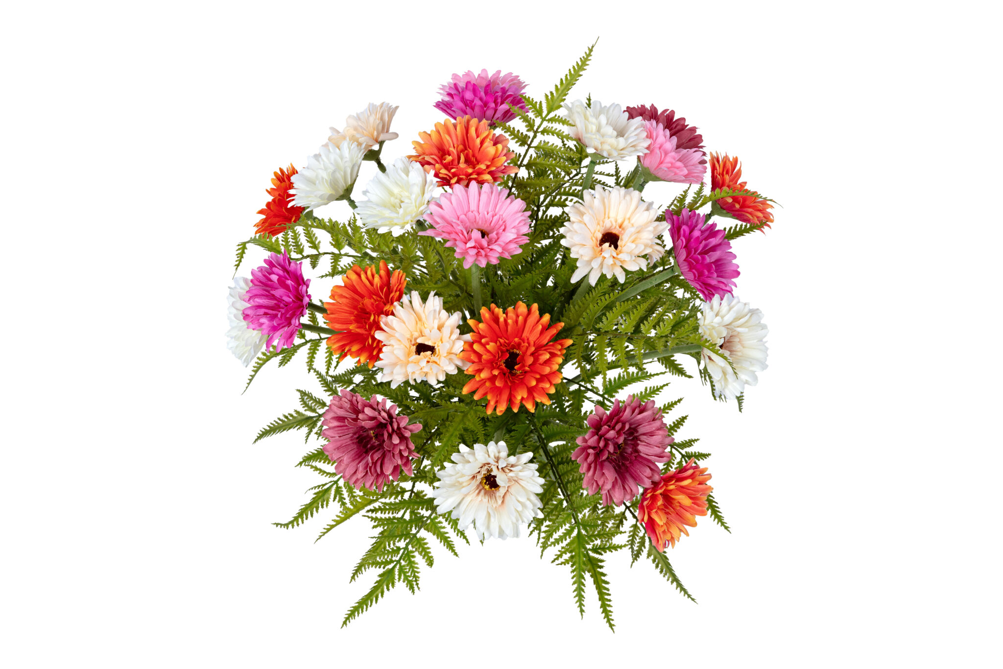 Prachtig gemengd Gerbera boeket met 24 gerbera’s en varen blad samengebonden als een geheel.