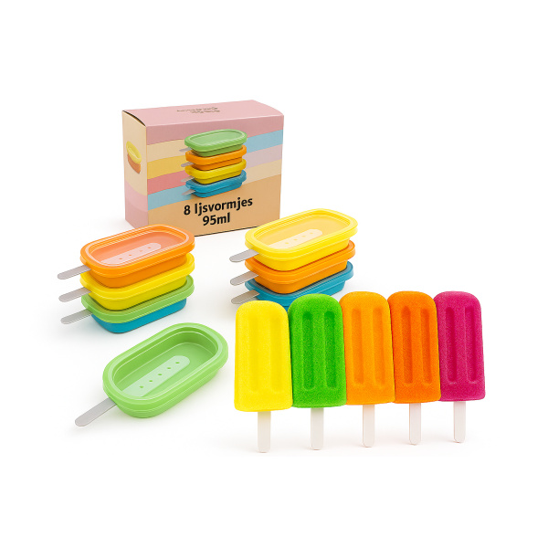 Veilig online shoppen doe je bij ons!Met deze set van 8 middelgrote ijslolly vormpjes (95 ml) maak je in een handomdraai je eigen, kleurrijke ijslolly’s thuis.