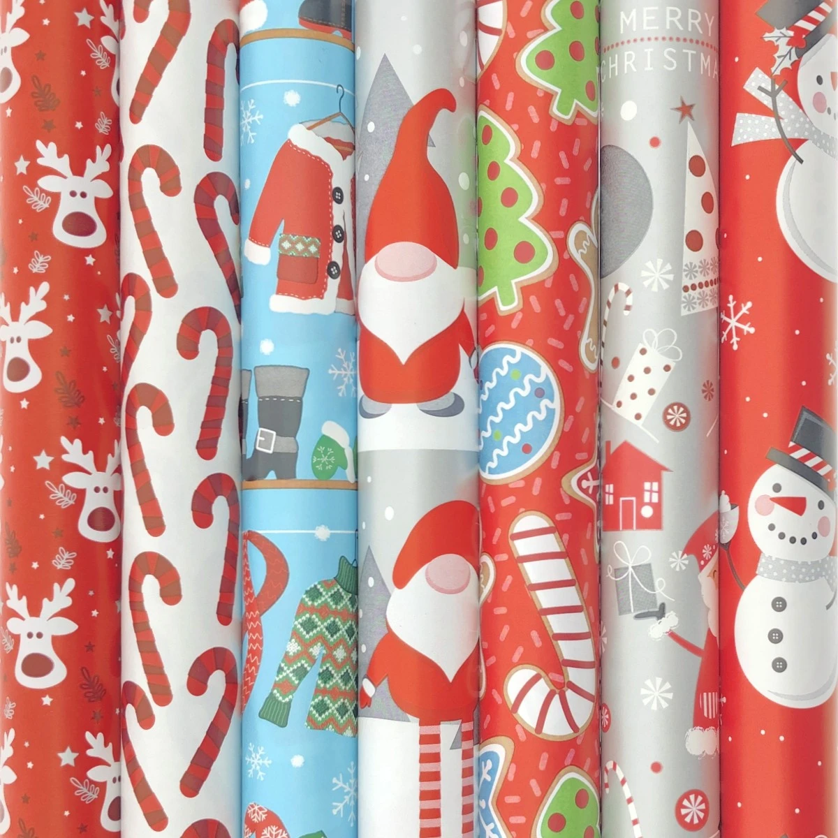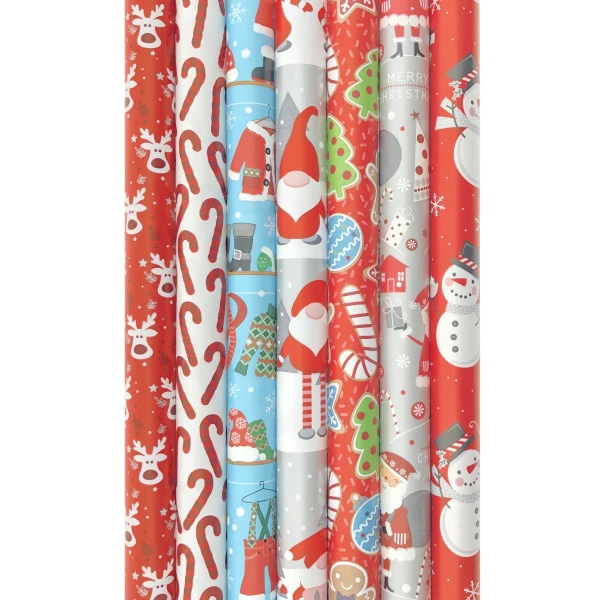Assortiment van 7 rollen cadeaupapier voor kerstmis.