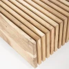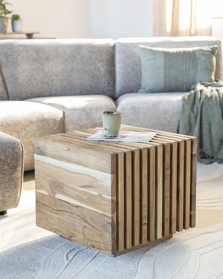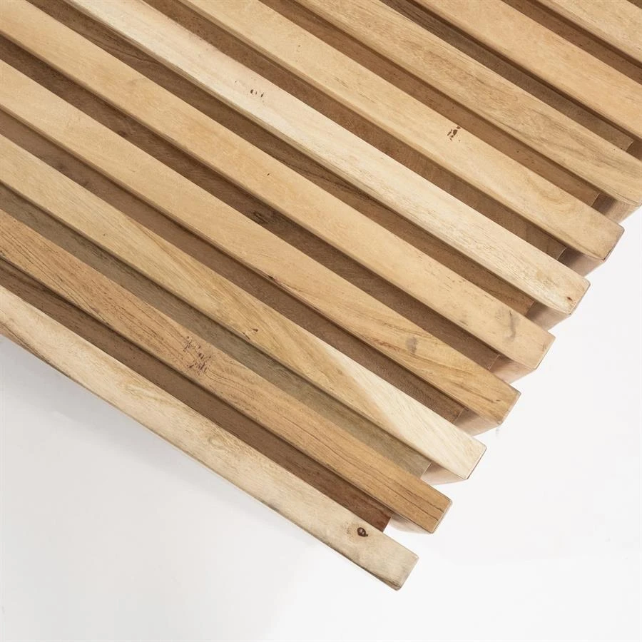 De verticale stroken mangohout in combinatie met de vierkante vorm en ingelegde latjes geeft deze tafel zijn eigen unieke stijl.