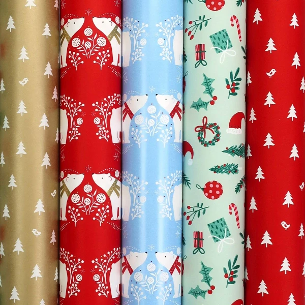 Assortiment kerstpapier om je cadeau een mooi uiterlijk te geven.