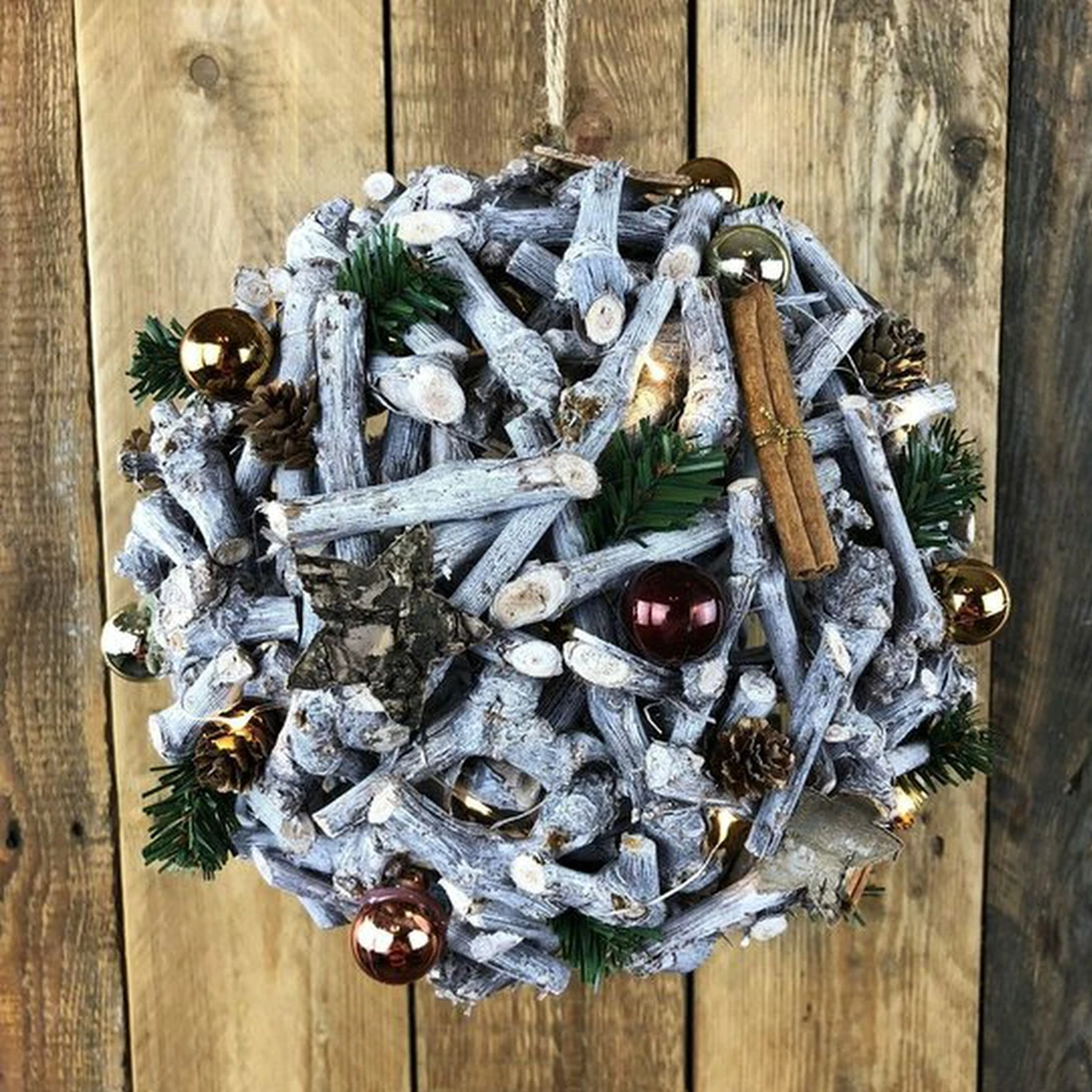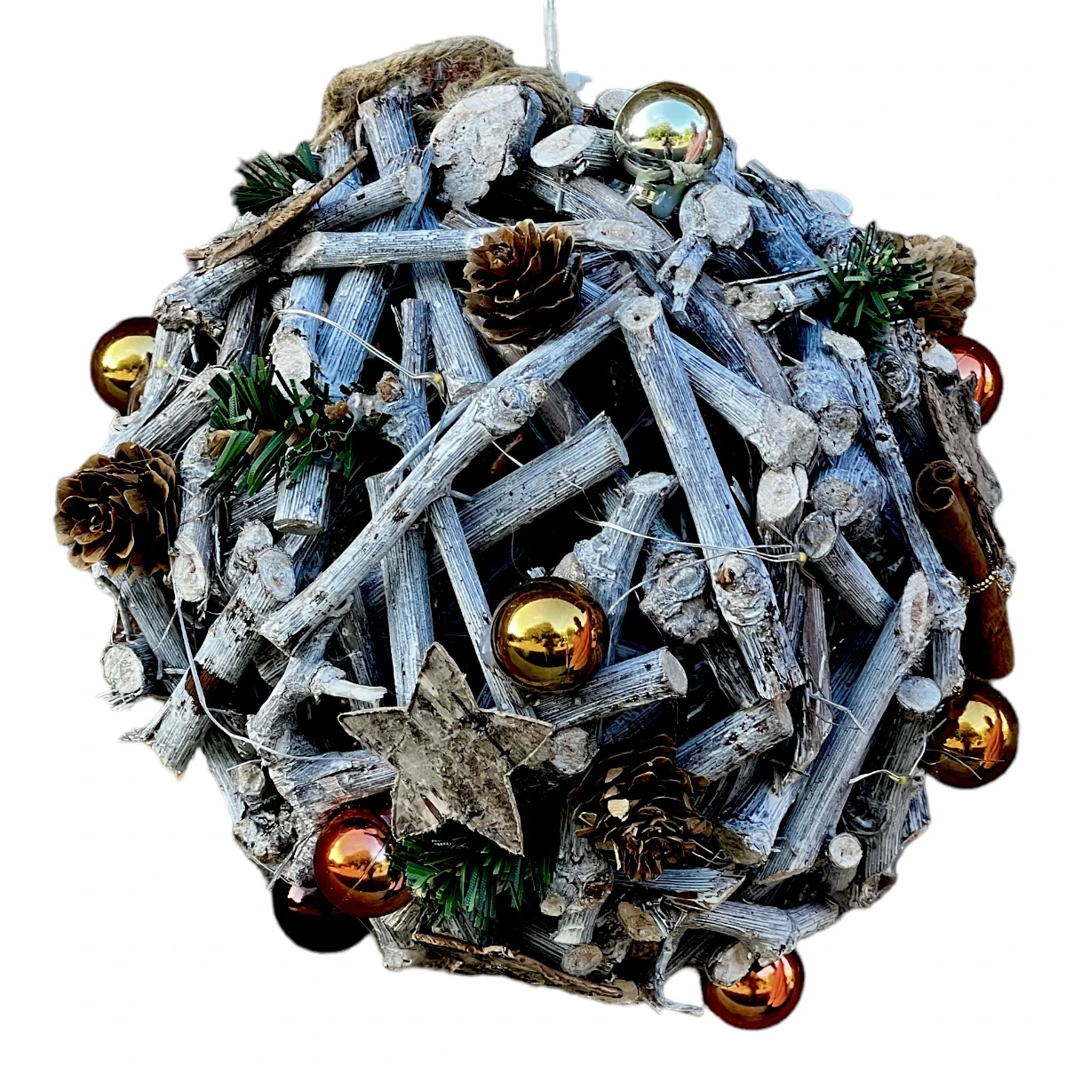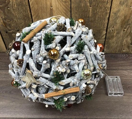 Sfeervolle takkenbal met 10 Micro ledlampjes, werkt op 3 AA batterijen (exclusief), De takkenbal is voorzien van Kersballetjes, guirlande, kaneelstokjes, Houten sterren en dennenappels.