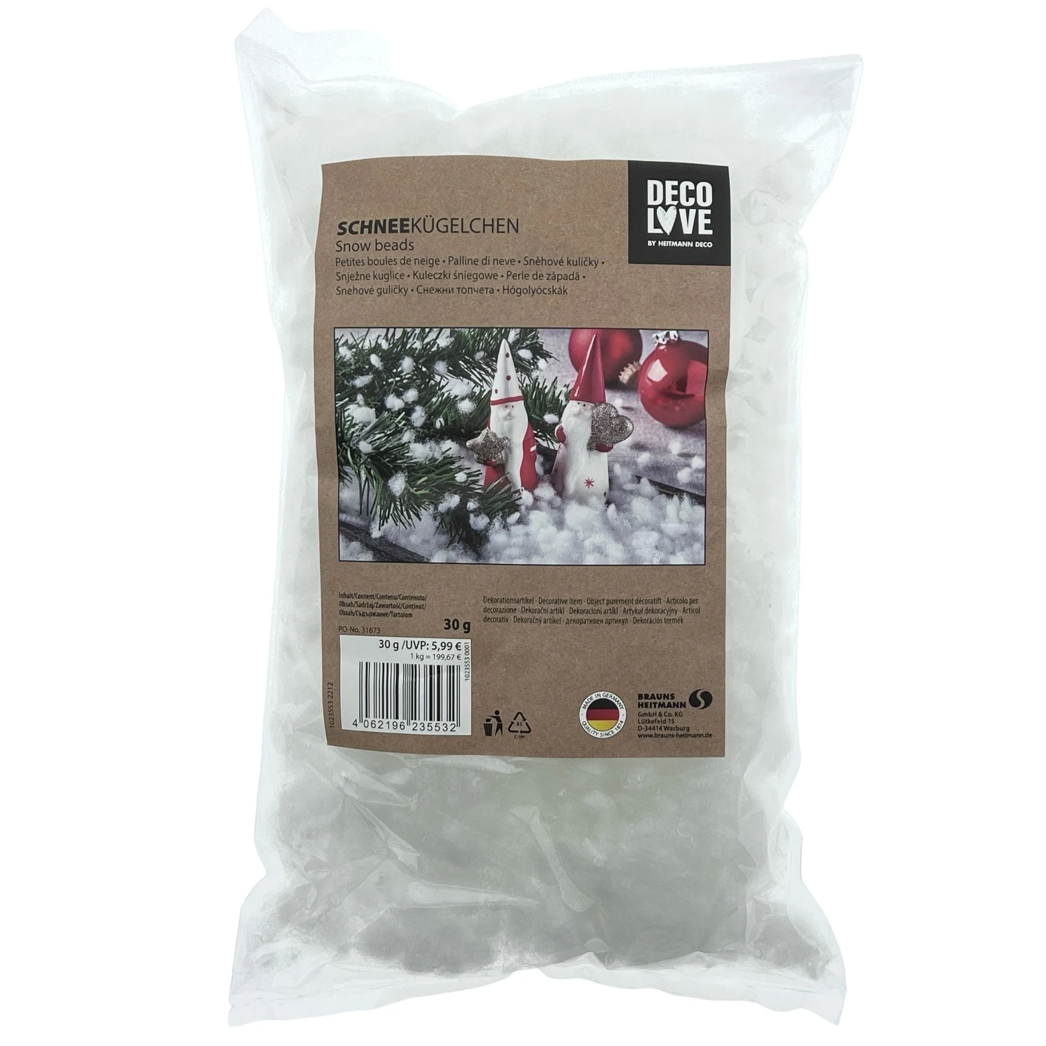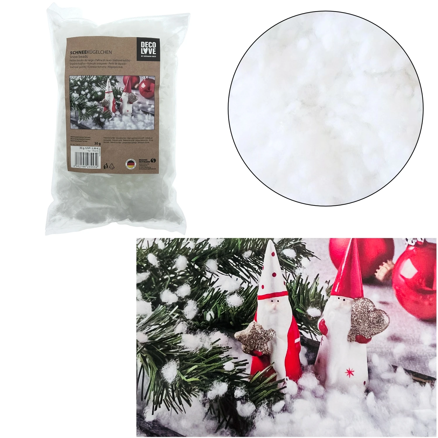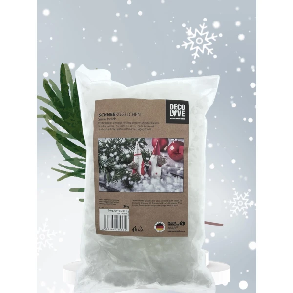 Het is bijzonder lichte, volumineuze kunstsneeuw en daarom bijzonder geschikt als je met weinig moeite een dikke laag sneeuw wilt versieren , of als je sneeuwbanken wilt weergeven.