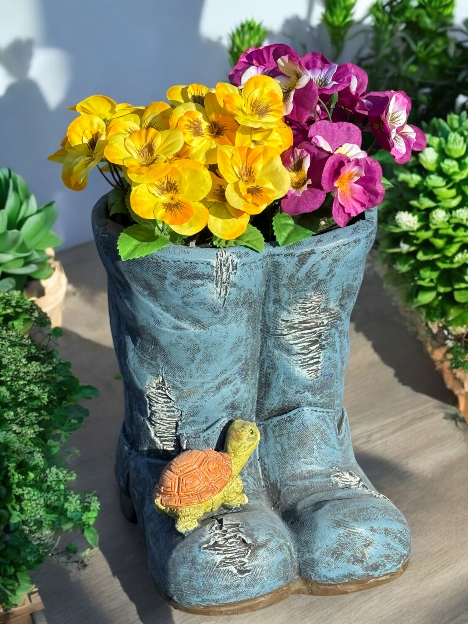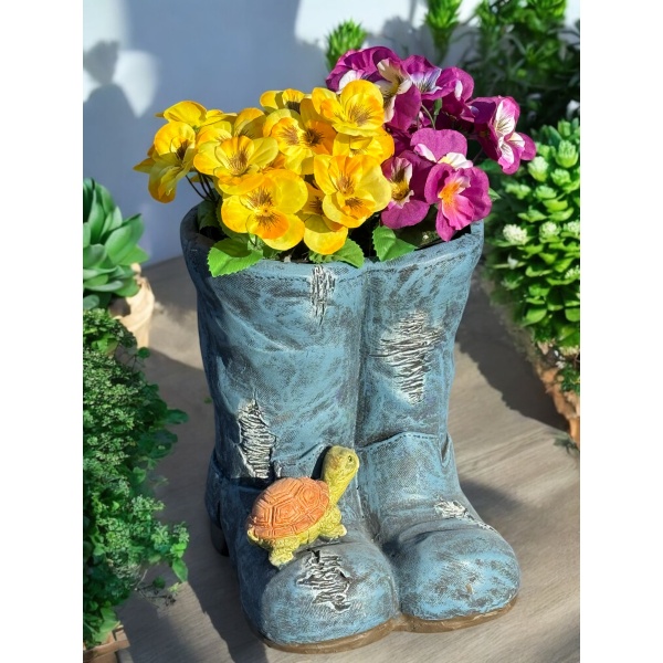 Breng een vleugje creativiteit in uw tuin of huis met deze unieke decoratieve bloempot in de vorm van een paar laarzen. Gemaakt van duurzaam magnesia, is deze bloempot niet alleen een opvallende blikvanger, maar ook geschikt voor zowel binnen- als buitengebruik.