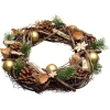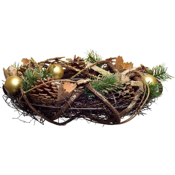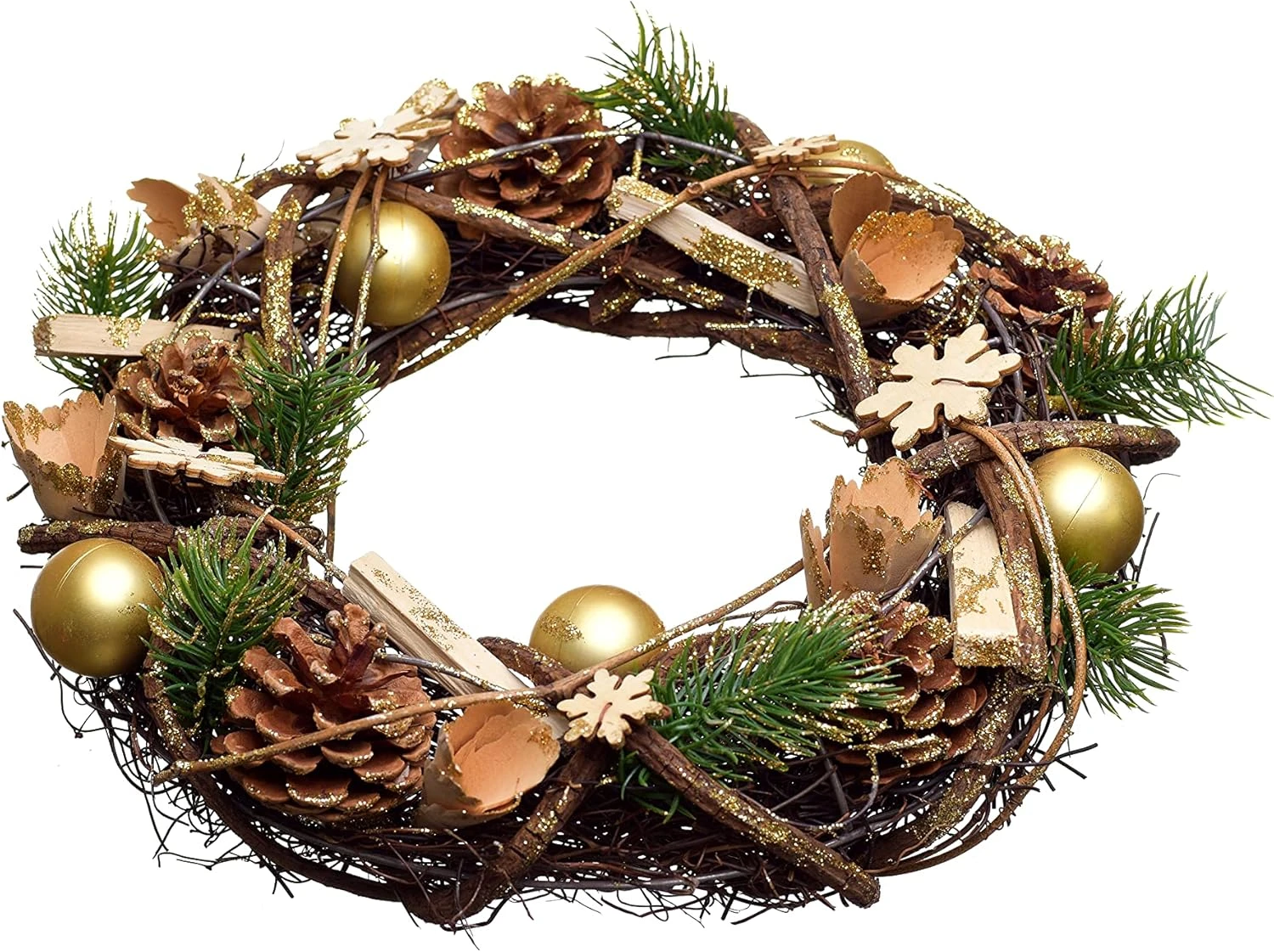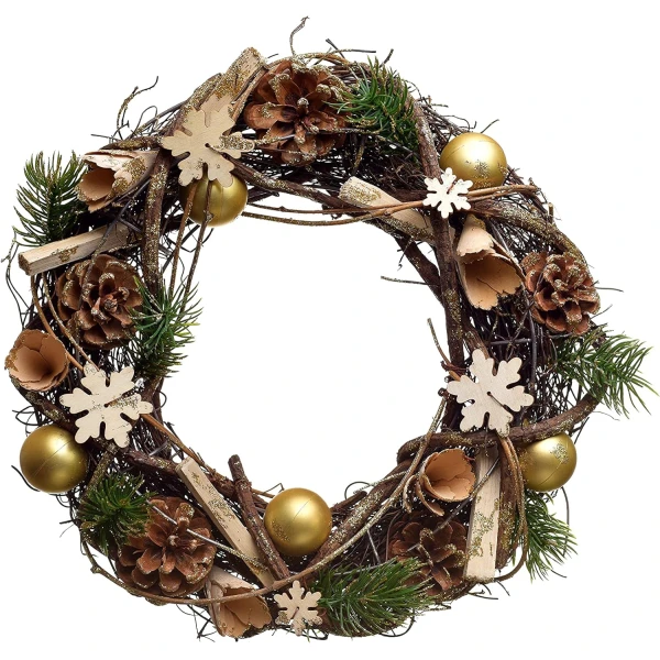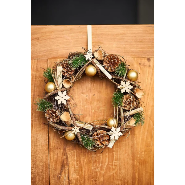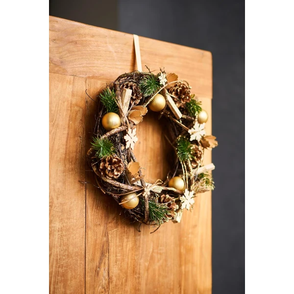 Modern: de krans is gemaakt van takken. De takken zijn bruin, versierd met gouden ballen en gouden glinsterende highlights, die als blikvanger zijn verwerkt, een mooie welkomstmaat als je de deurkrans buiten op je toegangsdeur plaatst.