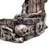 Deze leuke gothic asbak is een echte aanwinst voor ieder huis. Een echte decoratieve toevoeging, op de tuintafel of op het bureau. De bijzondere asbak is zilverkleurig en heeft een pilaar aan de zijkant waar een ondeugend kijkende gargoyle aan hangt, de asbak is gevormd als een muurtje met doodshoofden er om heen, en de gargoyle zit op een berg muntjes.