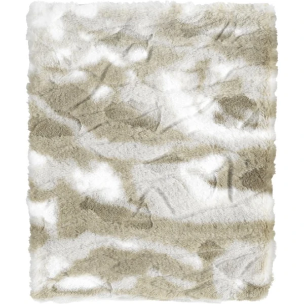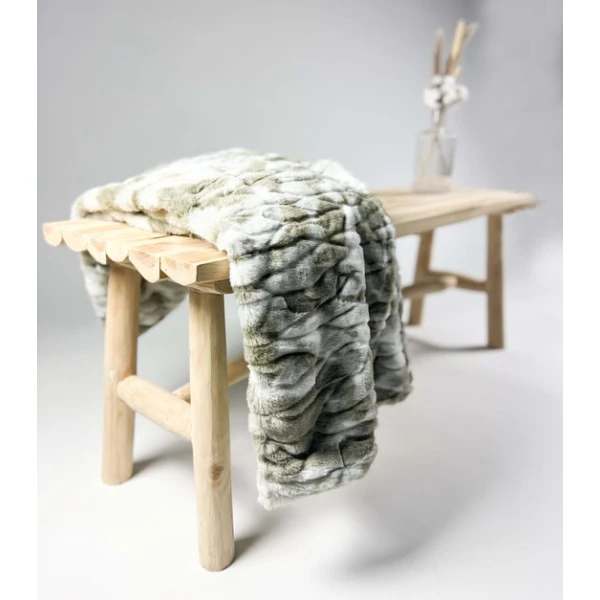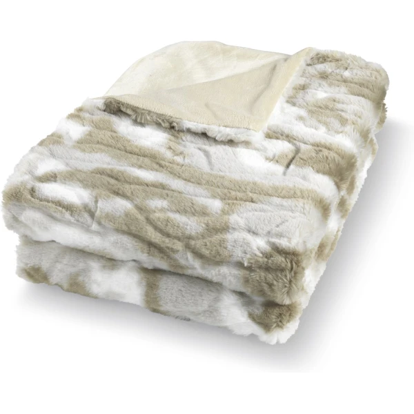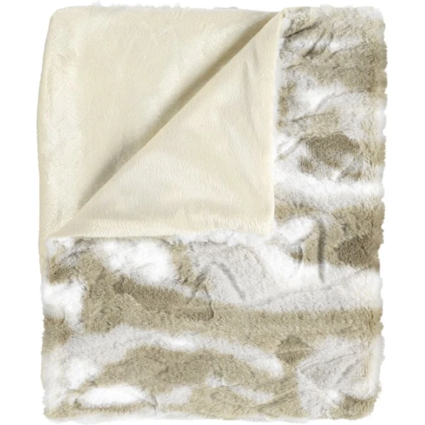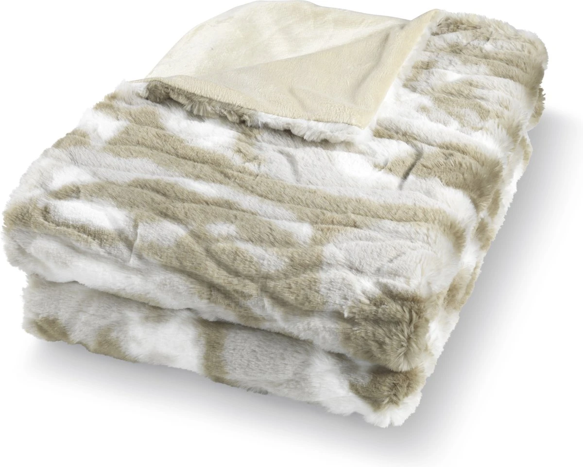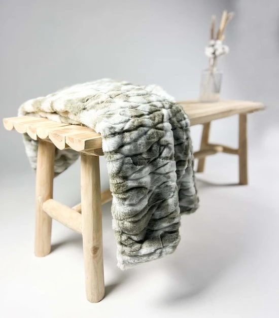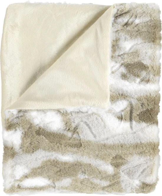 Superzacht en zwaar plaid met bontlook in de kleuren olijfgroen, beige en wit.