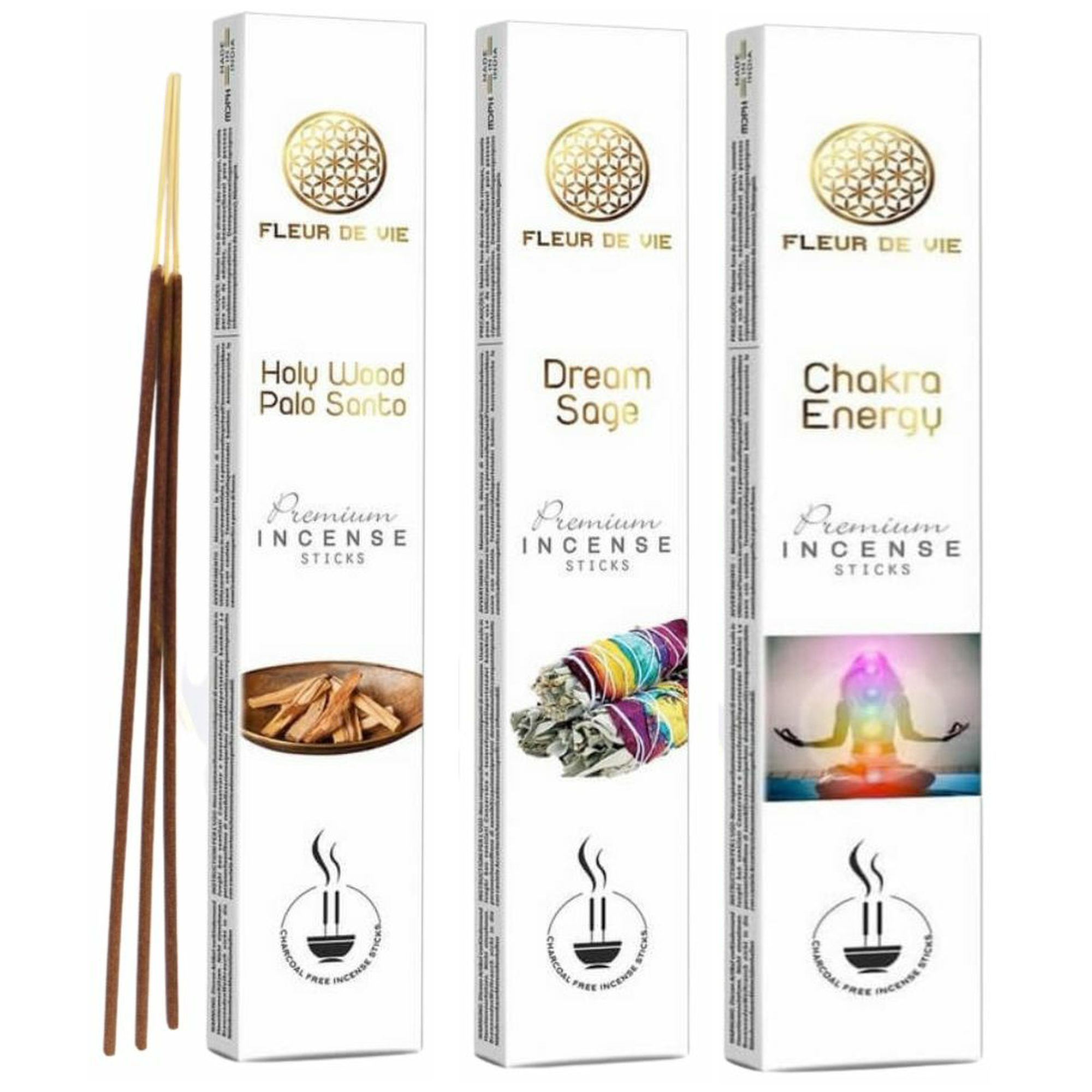 Fleur de Vie – Premium Wierookstokjes – 3 Assortiment – 3 x 16 gram – Chakra Energy – Holy Wood Palo Santo – Dream Sage