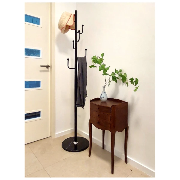Praktisch en Elegant: De haken aan de bovenkant van de kapstok bieden een handige plek om je kleding op te hangen, terwijl de marmeren voet niet alleen stabiliteit biedt, maar ook een vleugje luxe toevoegt aan je interieur.
