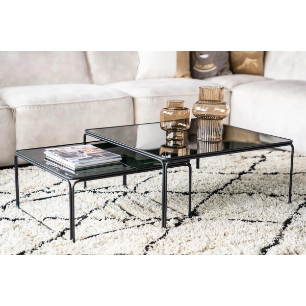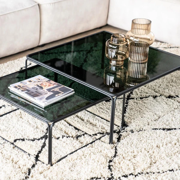 Salontafel Olit large set van 2 van staal en glas. Deze twee leuke salontafeltjes zijn vervaardigd uit staal en vervolgens gecoat. De afmetingen zijn: 75x75x33 / 60x60x28 cm (lxbxh). Wij raden aan om de tafels schoon te maken met een droge katoenen doek. Wil je nog bijpassende planttafels? Ga dan voor de Planttafel Olit small set van 2. .of Bijzettafel Olit Medium (set van twee)