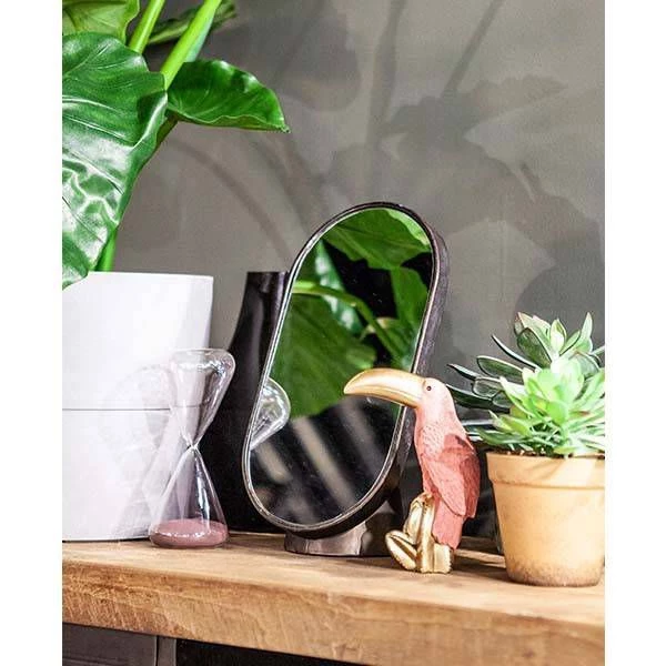 Perfect op iedere tafel of dressoir deze staande spiegel Vanity Four. Gemaakt van metaal met een spiegel in een mooie ronde vorm, handig voor op de eettafel maar ook een ware toevoeging tot je woonaccessoires in je interieur. Hij heeft een afmeting van 30 x 16 x 13 centimeter en is leuk te combineren met de andere gave spiegels uit de collectie van Vanity. Deze musthave wil je echt!!