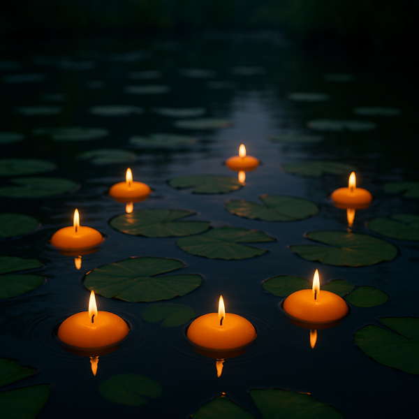 Leg de drijfkaarsen voorzichtig op het wateroppervlak.