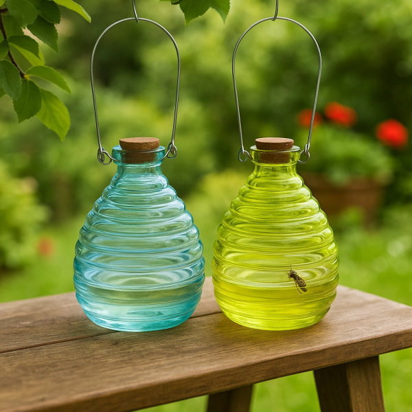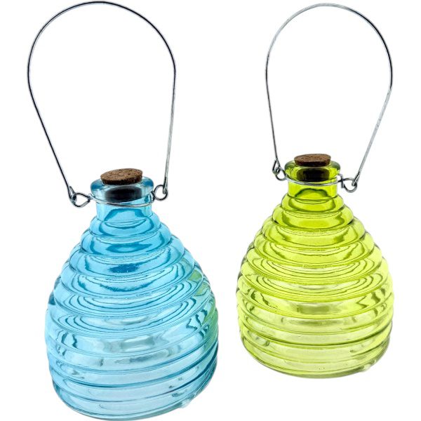 Houd vervelende wespen op afstand met deze stijlvolle glazen wespenvangers. De set bestaat uit twee kleurrijke vangers in de tinten helderblauw en geelgroen, met een decoratief ontwerp dat doet denken aan een bijenkorf. Ze zijn niet alleen effectief, maar ook een charmante toevoeging aan je tuin, terras of balkon.