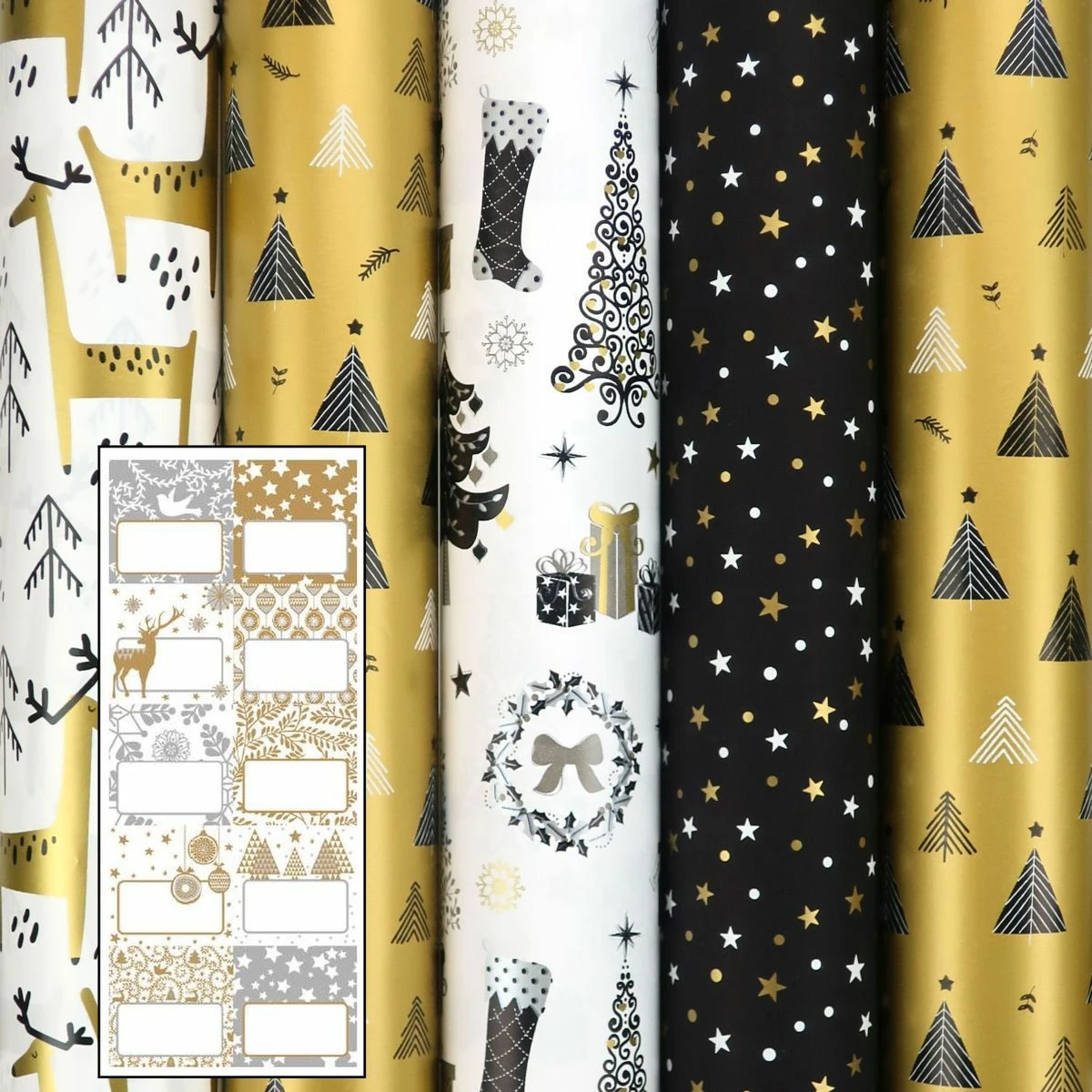 GOLDEN WINTERTIME – kerstpapier assortiment cadeaupapier inpakpapier voor kerst – 2 meter x 70 cm – 5 rollen – inclusief labels