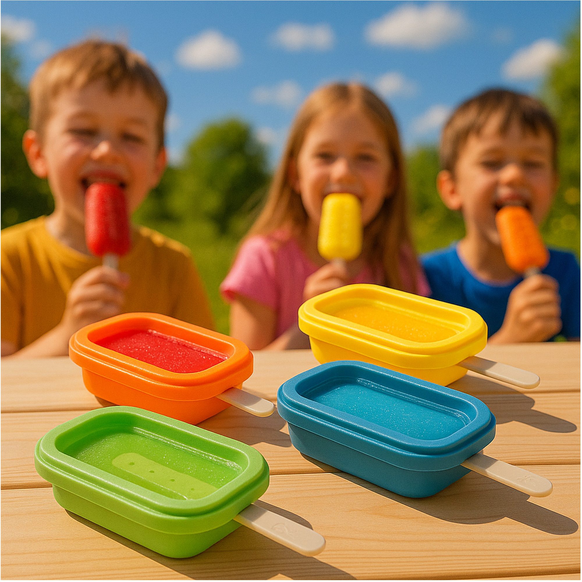 - Levendige Kleuren: De set bevat vier vrolijke kleuren (Blauw, groen, geel en oranje), waardoor het maken van ijsjes nog leuker wordt en de set een kleurrijke toevoeging is aan je keuken.