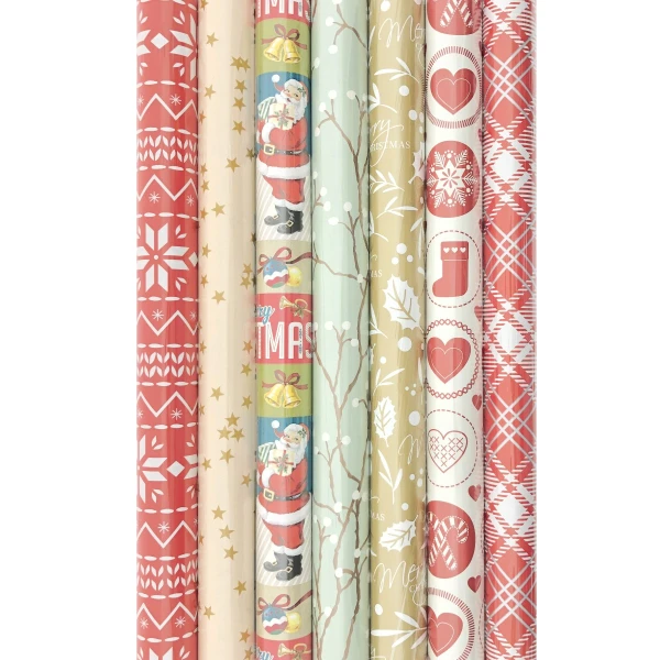 Kerstcadeaupapier is een essentieel onderdeel van de feestdagen. Met 7 rollen van 200 cm lang en 70 cm breed, biedt dit pakket ruim voldoende papier om al je cadeaus in te pakken.