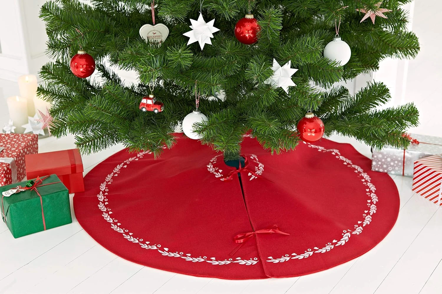 -Design: Dit ronde linnen kerstboomkleed bestaat uit een helder rood en een wit kerstpatroon. De kerstboomkleed is door zijn motief modern, maar vanwege de kleur nog steeds traditioneel. De kerstboomkleed maakt het resultaat van een versierde boom nog completer