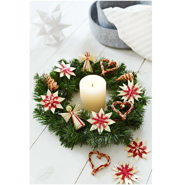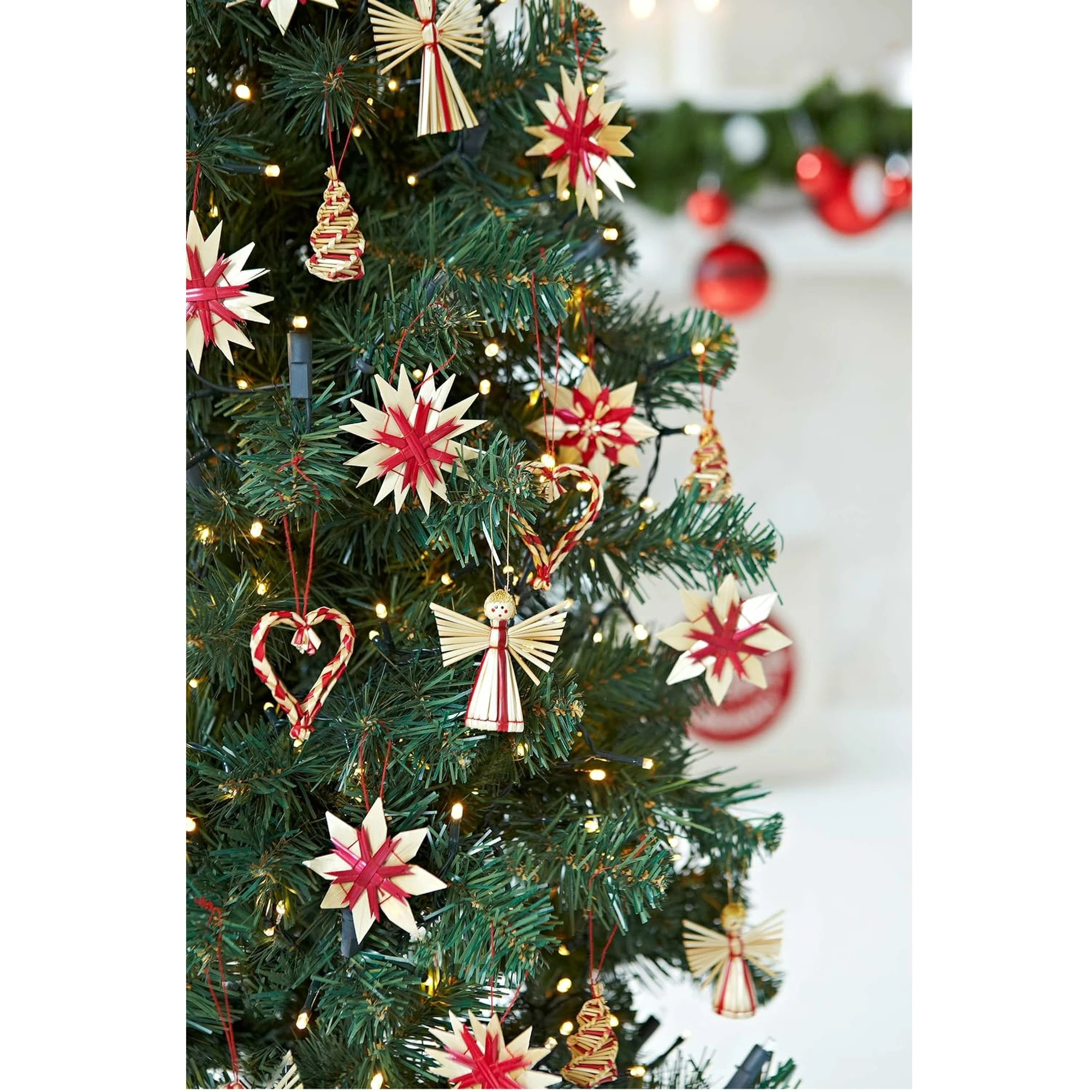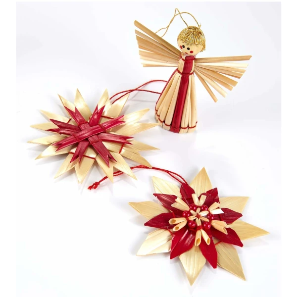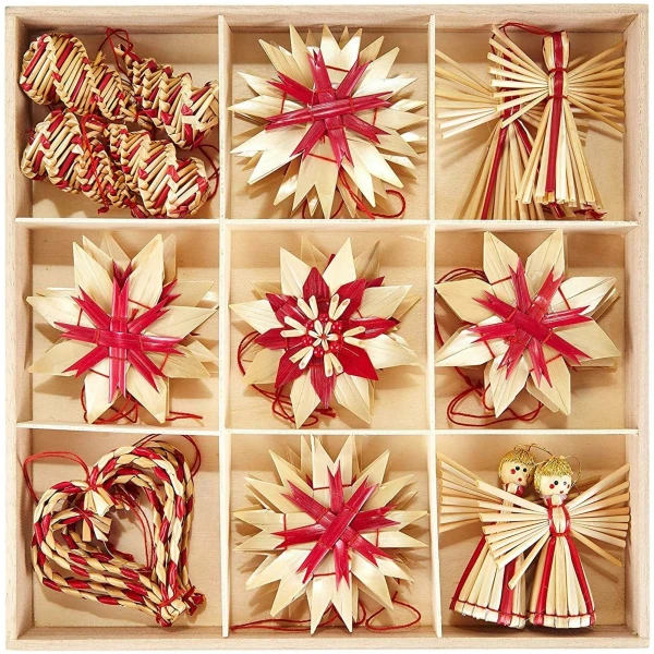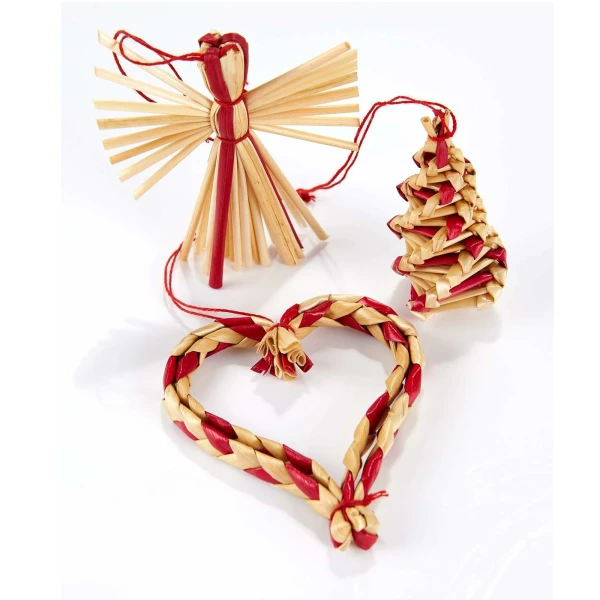 Veilig online shoppen doe je bij ons!Harten, sterren en engelen van stro met mooie rode accenten vind je in deze decoratieve set. Elk sieraad heeft een fijn rood lint. Dus, gewoon ophangen en klaar Zo versier je kerststruiken, takken of de dennenboom heel traditioneel.