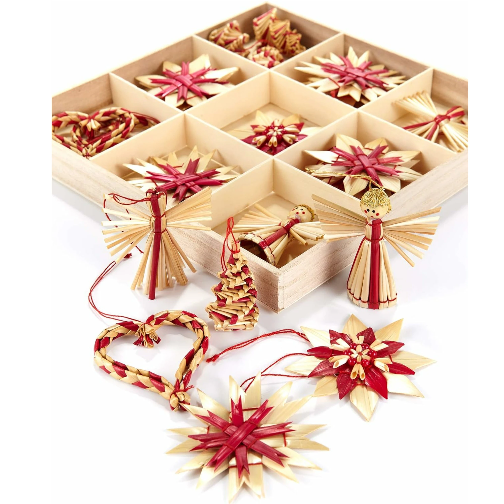 Kerstboomversiering van stro – stro boomversiering met rode accenten – 25-delige set