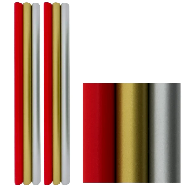6 luxe rollen Kerst cadeaupapier in de kleuren rood zilver en goud die onderling ook mooi te combineren zijn.