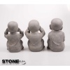 Een mooi setje Kind Monnik Beeldjes set3. Dit setje horen zien en zwijgen beeldjes is gemaakt van het lichtgewicht materiaal clayfibre (of fibreclay). Clayfibre is een mix van klei en glasvezel waardoor het bestand is tegen bijna alle weersomstandigheden. Voor jarenlang plezier raden wij wel aan het tuinbeeld met een goede lak te beschermen tegen (lichte) vorst en regen. Bij strenge vorst is het verstandig het boeddha beeld binnen te halen. Door de mooie lichtgrijze cementlook kleur zijn de horen zien en zwijgen boeddha beeldjes makkelijk over bij te combineren.