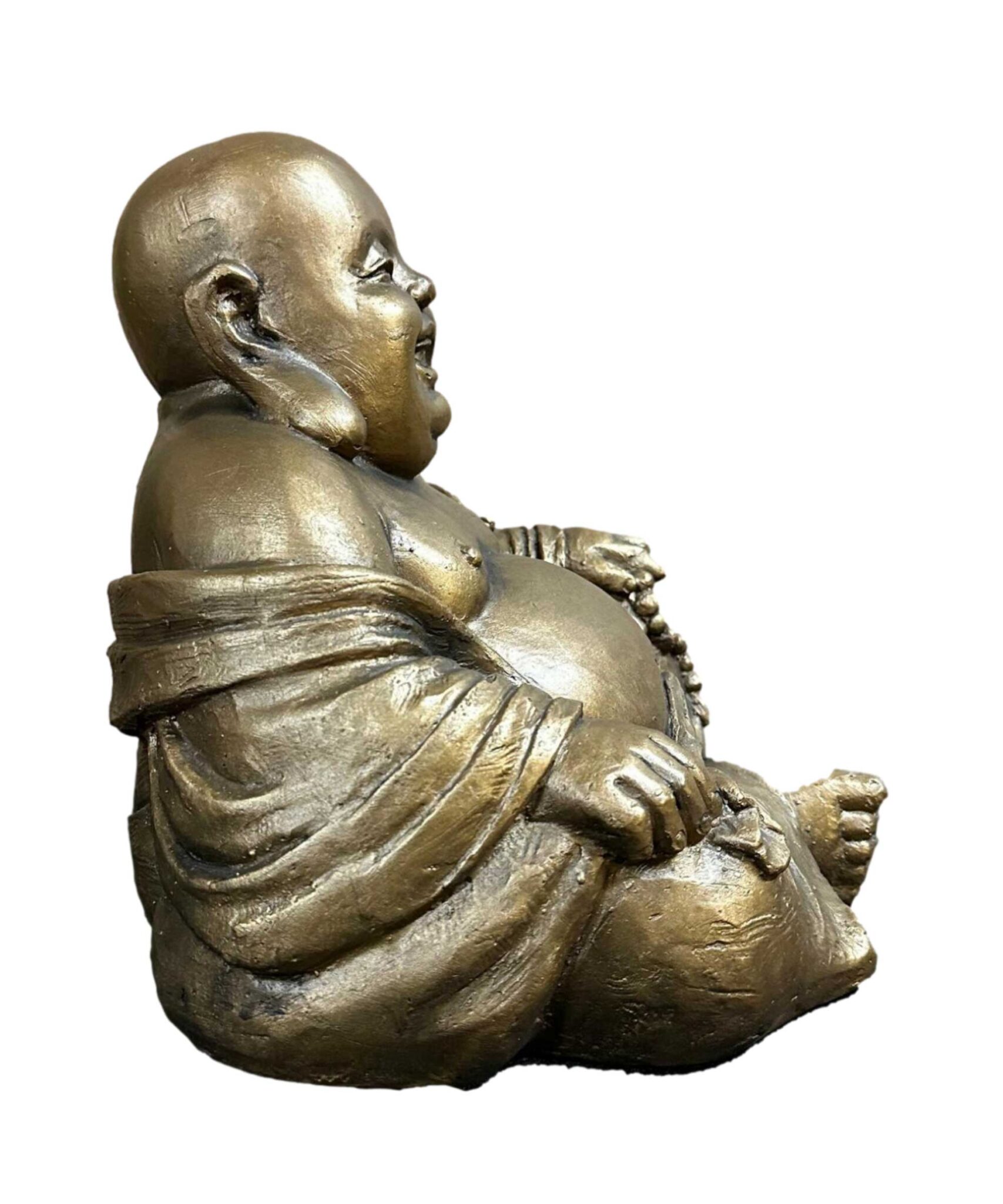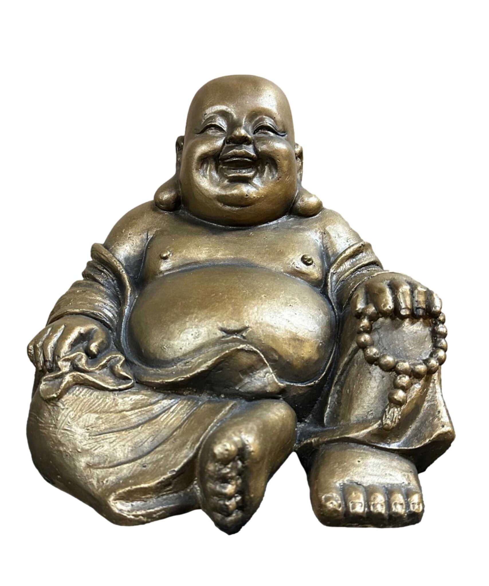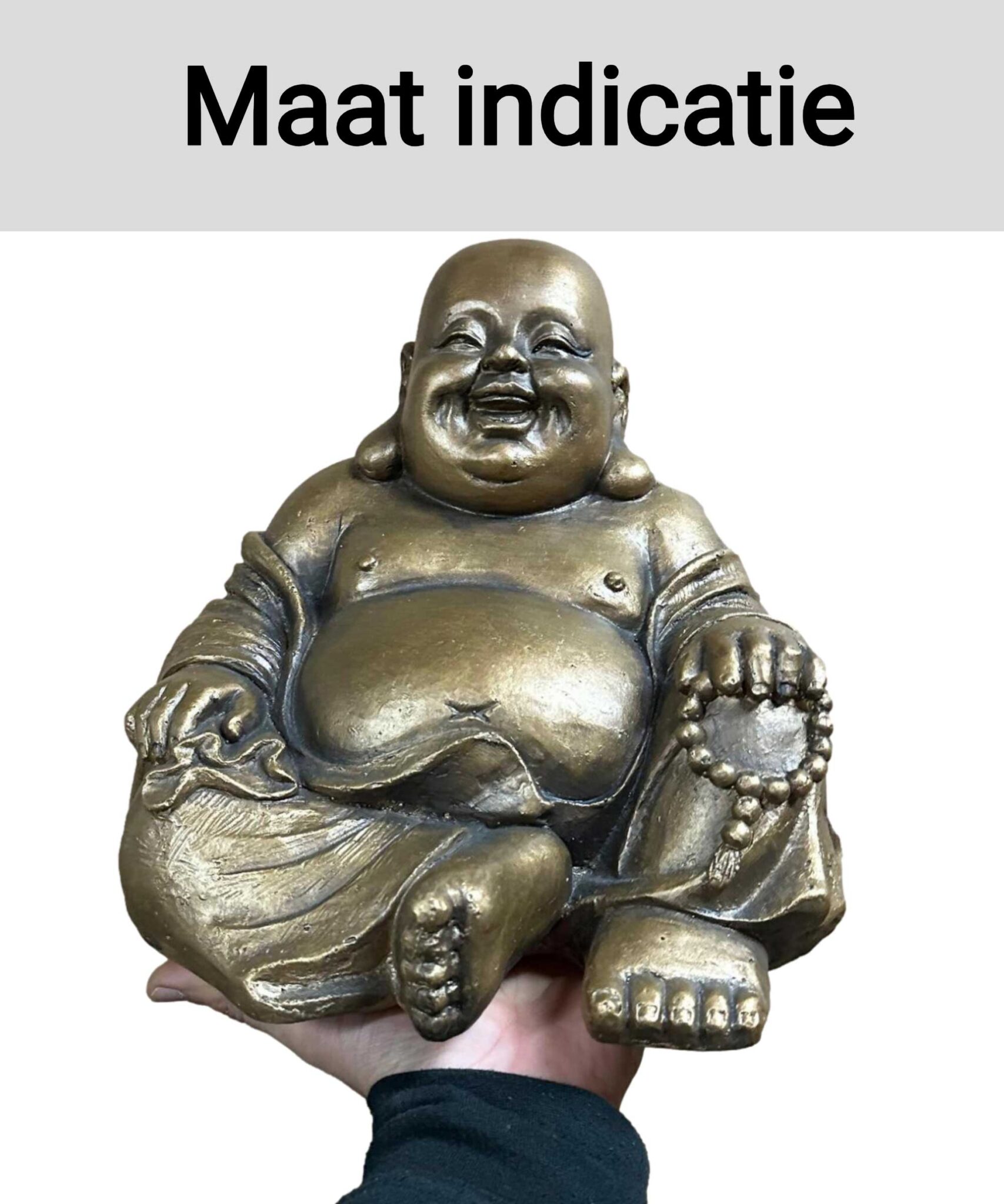 Met zijn vrolijke glimlach en kenmerkende bolle buik straalt hij positieve energie uit. De warme bronzen afwerking geeft dit beeld een elegante en tijdloze uitstraling, ideaal voor binnen én buiten.