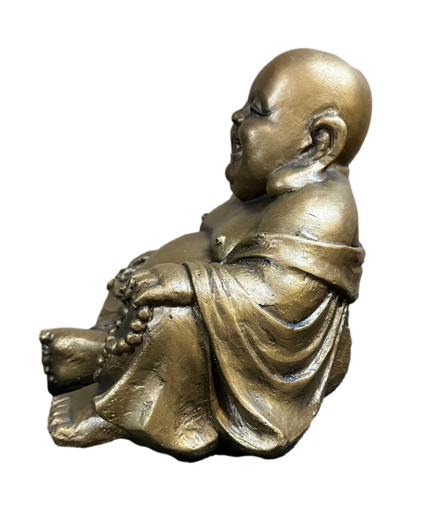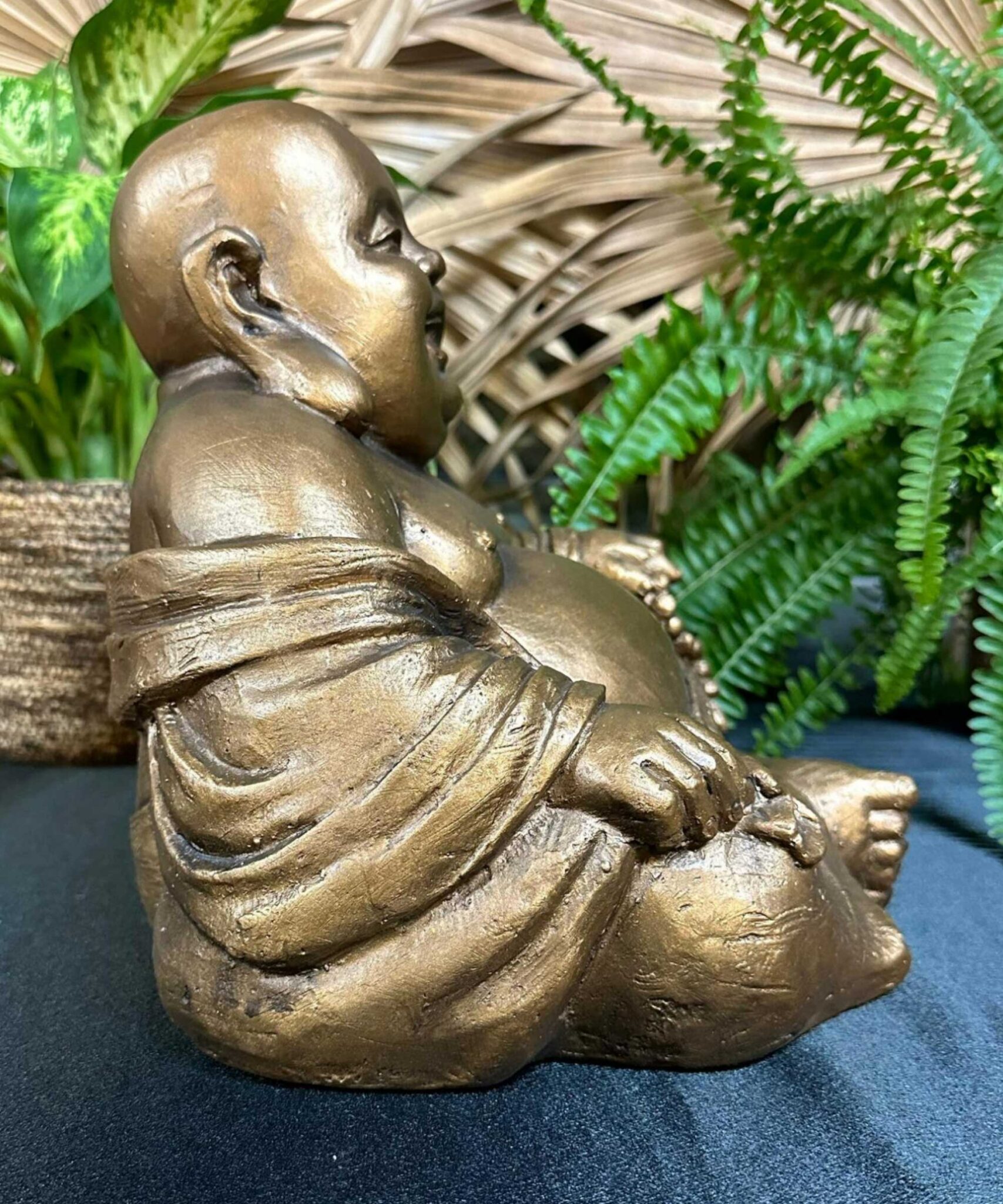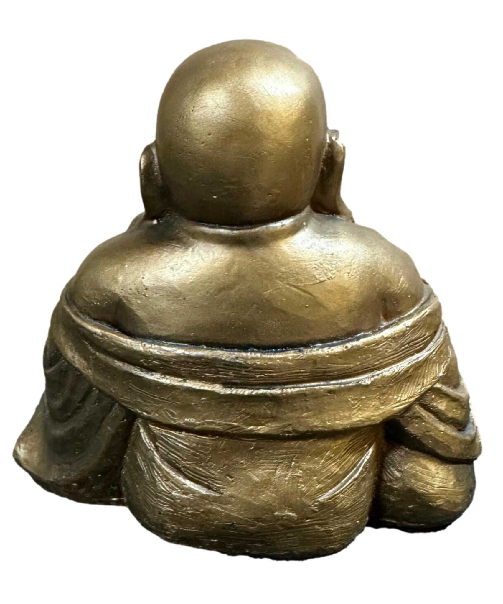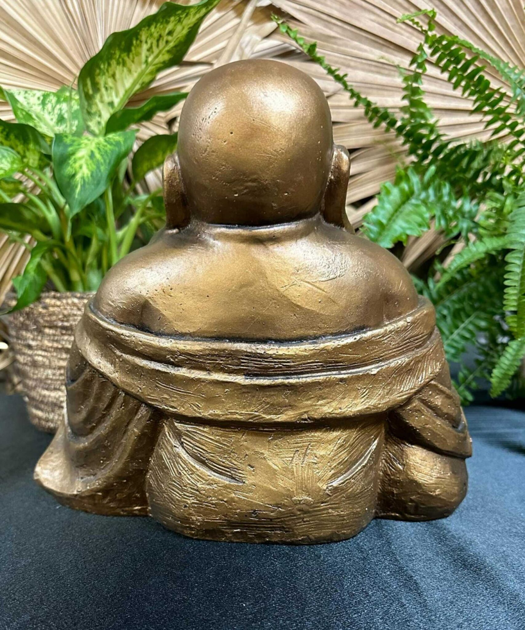 Met zijn vrolijke glimlach en kenmerkende bolle buik straalt hij positieve energie uit. De warme bronzen afwerking geeft dit beeld een elegante en tijdloze uitstraling, ideaal voor binnen én buiten.