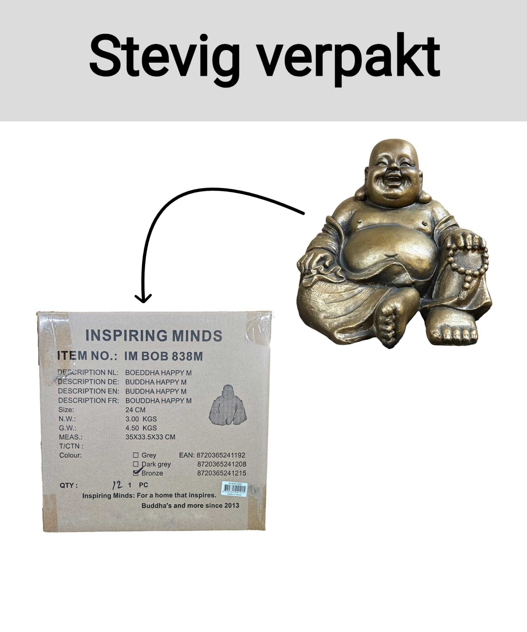 Jouw bronzen Dikbuik Boeddha wordt met zorg verpakt en gratis verzonden, zodat je meteen kunt genieten van zijn serene uitstraling.