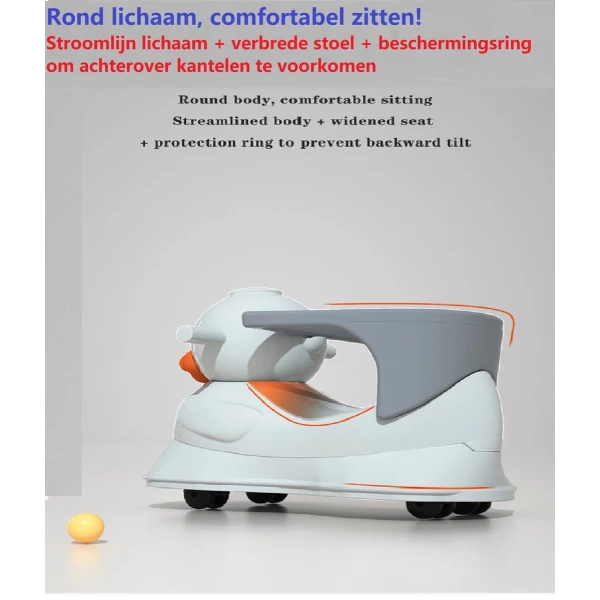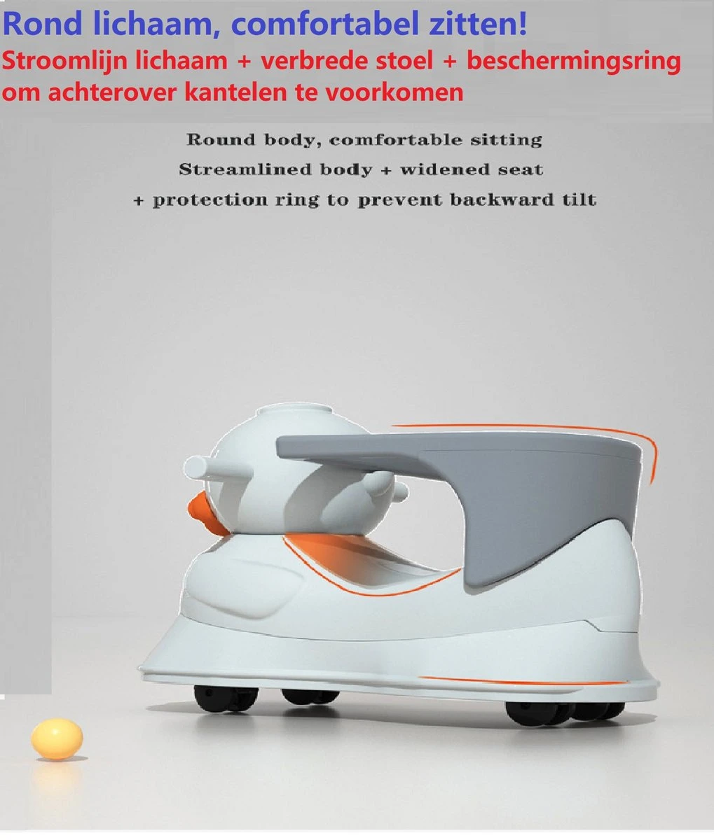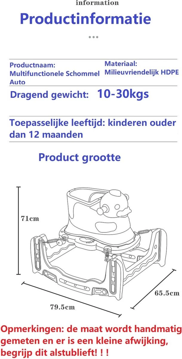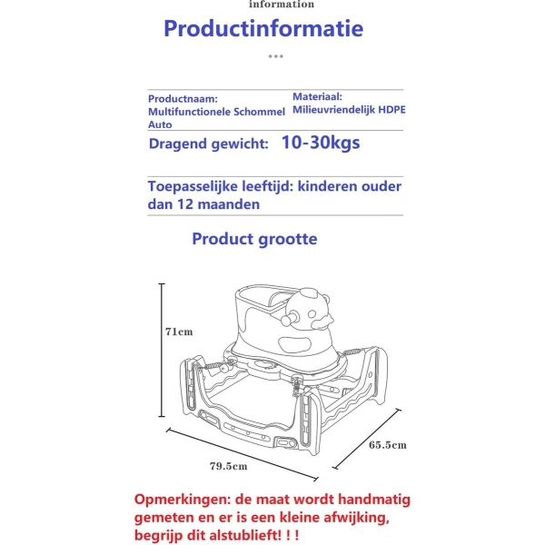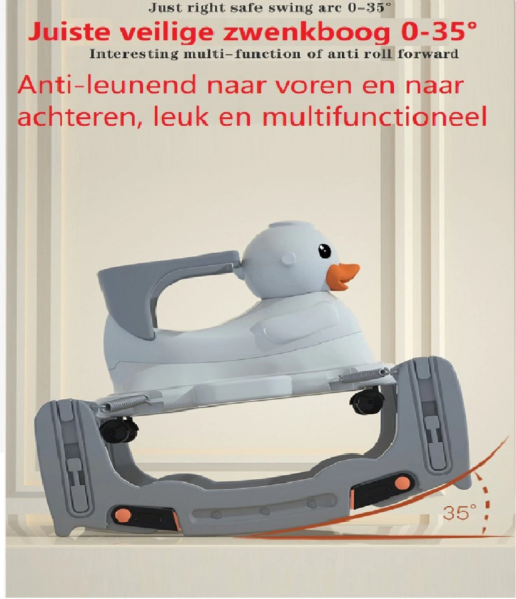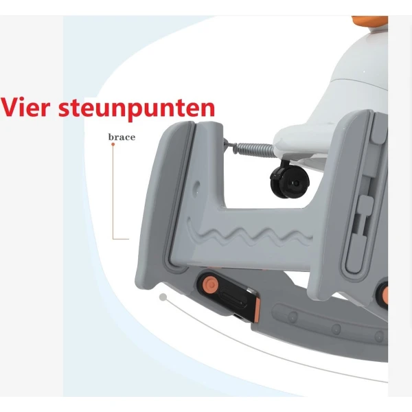 Handige en veilige multifunctionele kinder schommel stoel / loopwagen. De multifunctionele schommelstoel kan worden gebruikt als schommelstoel, als loopstoel, als loopfiets en als schommel auto. De multifunctionele kinderstoel is stabiel en voorzien van een anti kantel systeem, waardoor hij veilig is voor uw kind. De schommelstoel is gemaakt van milieuvriendelijke HDPE materialen en bevat geen toxische stoffen en dus geheel veilig. De schommelwagen is zodanig geproduceerd dat het geheel glad is en geen scherpe randen heeft. De verschillende functies dragen bij aan verschillende vormen van ontwikkeling van uw kind, zo verbeterd de loopfiets de balans en het evenwichtsgevoel van uw kind.