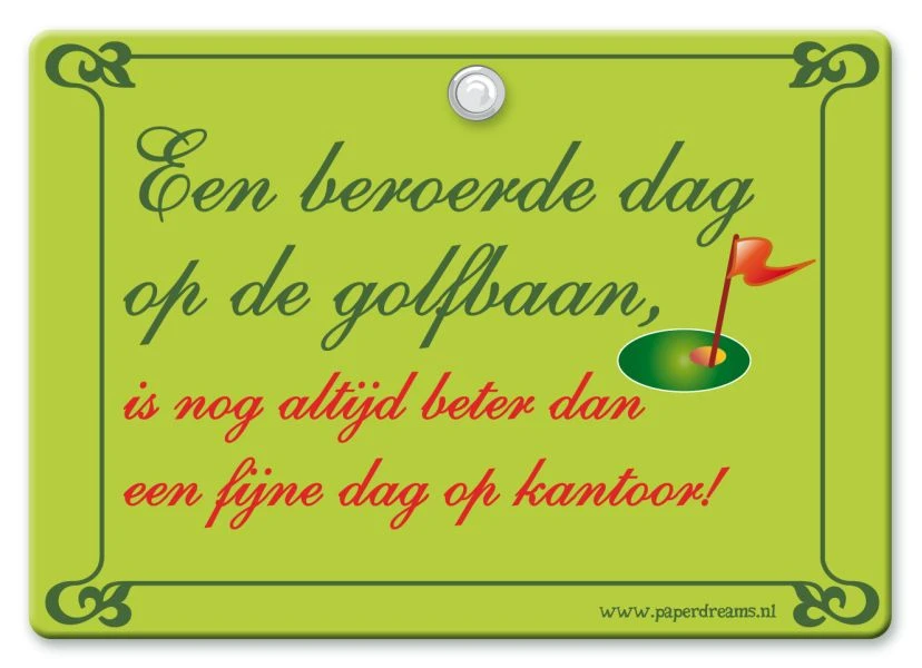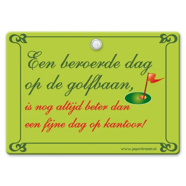 Metalen slogan, spreukenbord, tekst bord met de tekst: Een beroerde dag op de golfbaan, is nog altijd beter dan een fijne dag op kantoor!