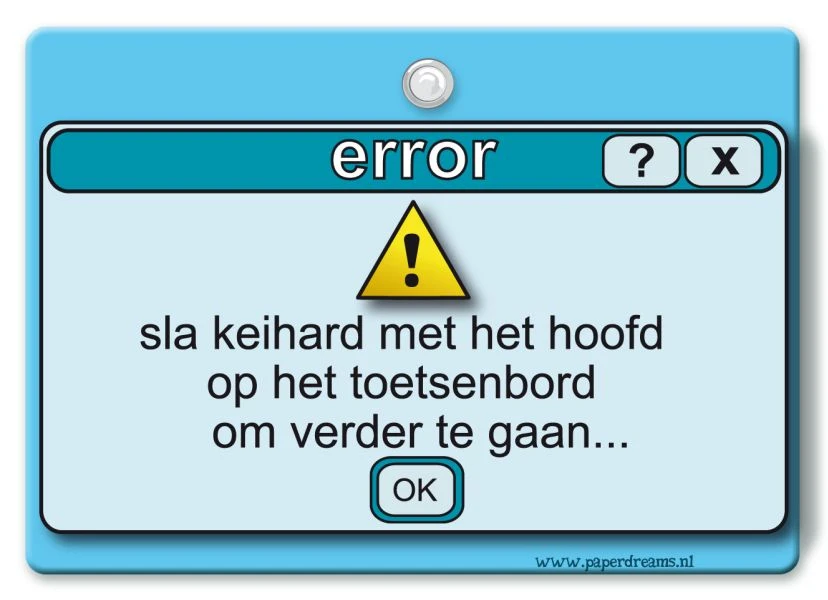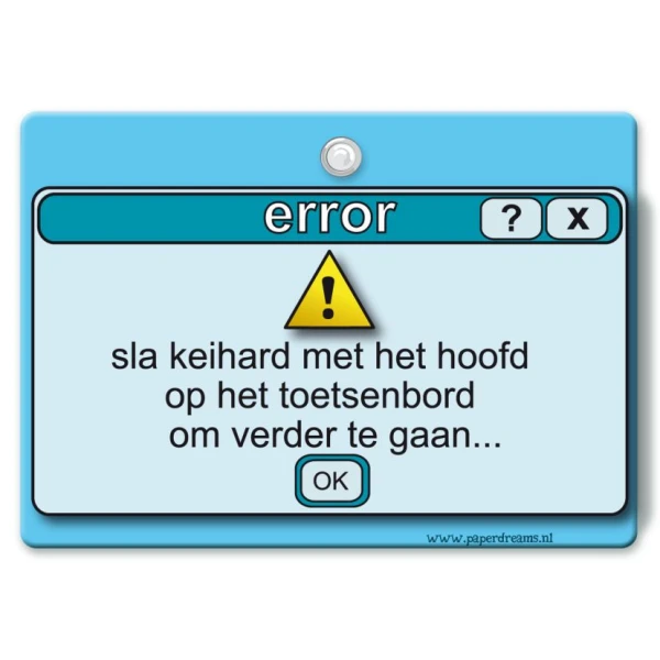 Metalen slogan, spreukenbord, tekst bord met de tekst: Error! Sla keihard met het hoofd op het toetsenbord om verder te gaan…