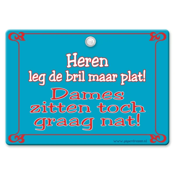 Metalen slogan, spreukenbord, tekst bord met de tekst: Heren leg de bril maar plat! Dames zitten toch graag nat!