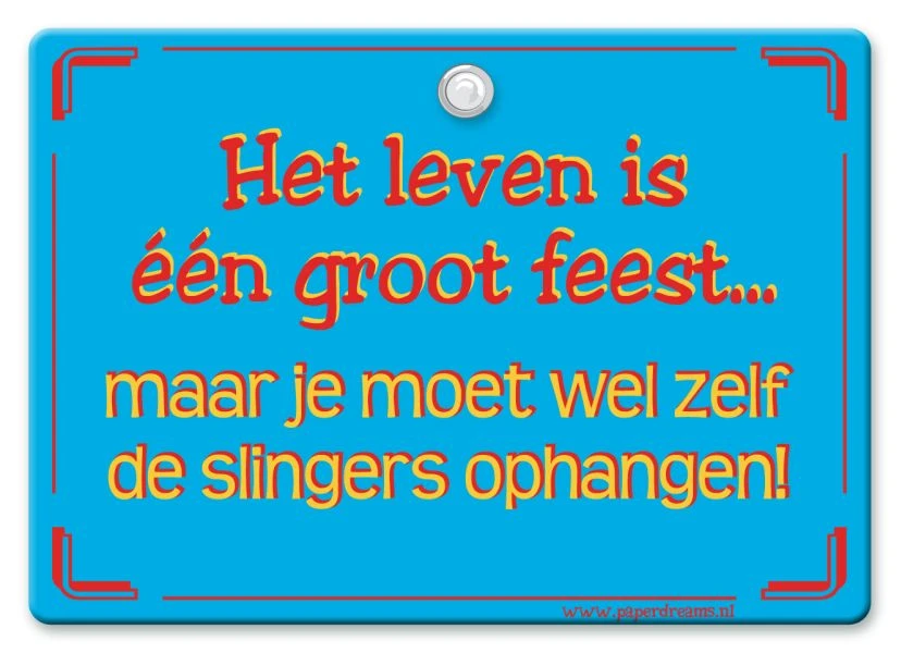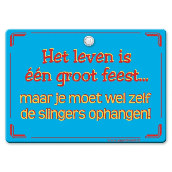 Metalen slogan, spreukenbord, tekst bord met de tekst: Het leven is een groot feest… maar je moet wel zelf de slingers ophangen!