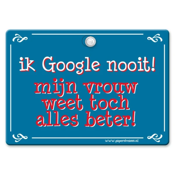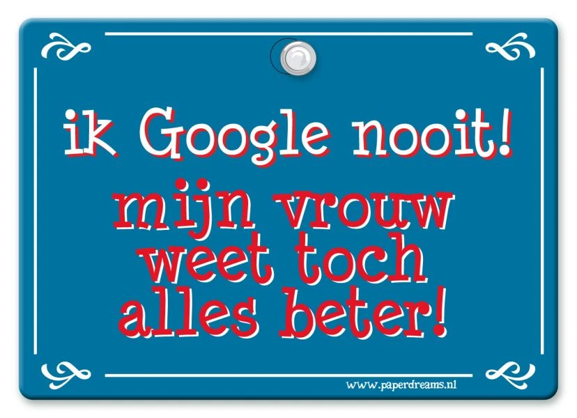 Metalen slogan, spreukenbord, tekst bord met de tekst: Ik Google nooit! Mijn vrouw weet toch alles beter!