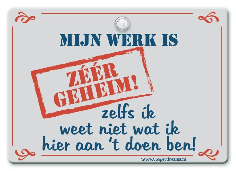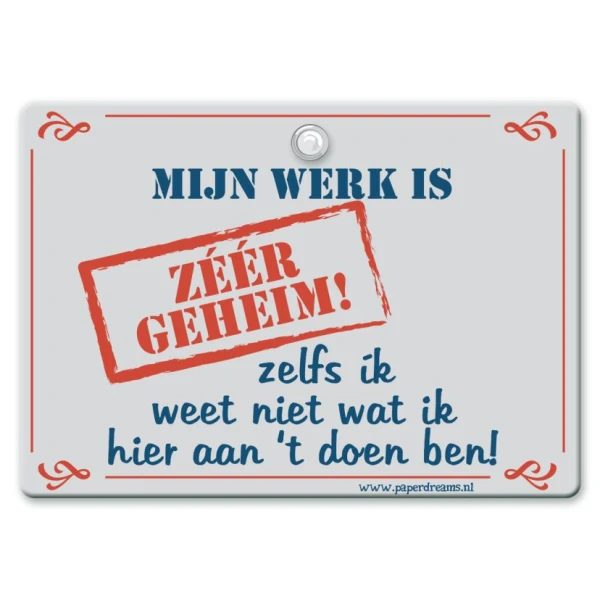 Metalen slogan, spreukenbord, tekst bord met de tekst: Mijn werk is zeer geheim! Zelfs ik weet niet wat ik hier aan ’t doen ben!