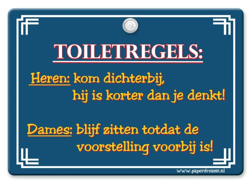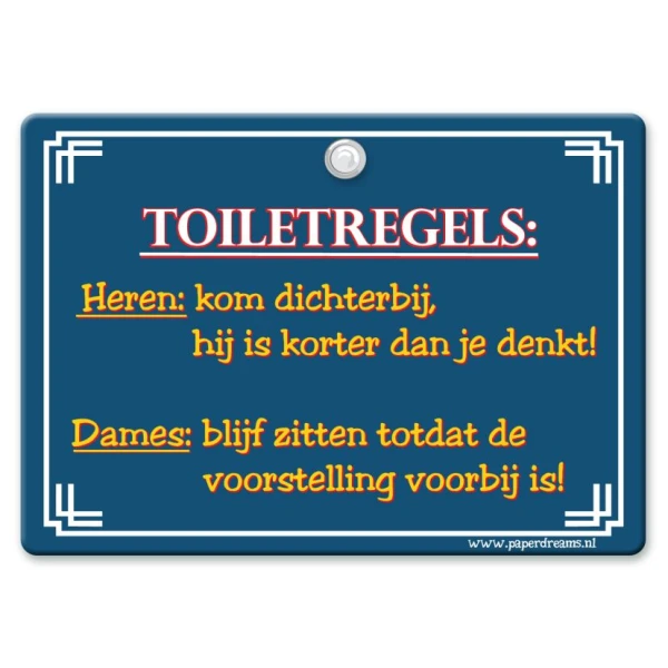 Metal Slogan – Spreukenbord – Tekst Bord – Toiletregels: Heren: kom dichterbij, hij is korter dan je denkt! Dames: