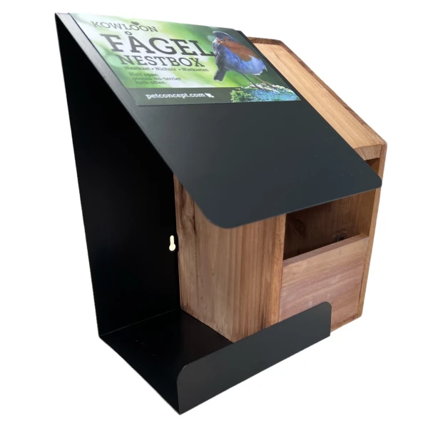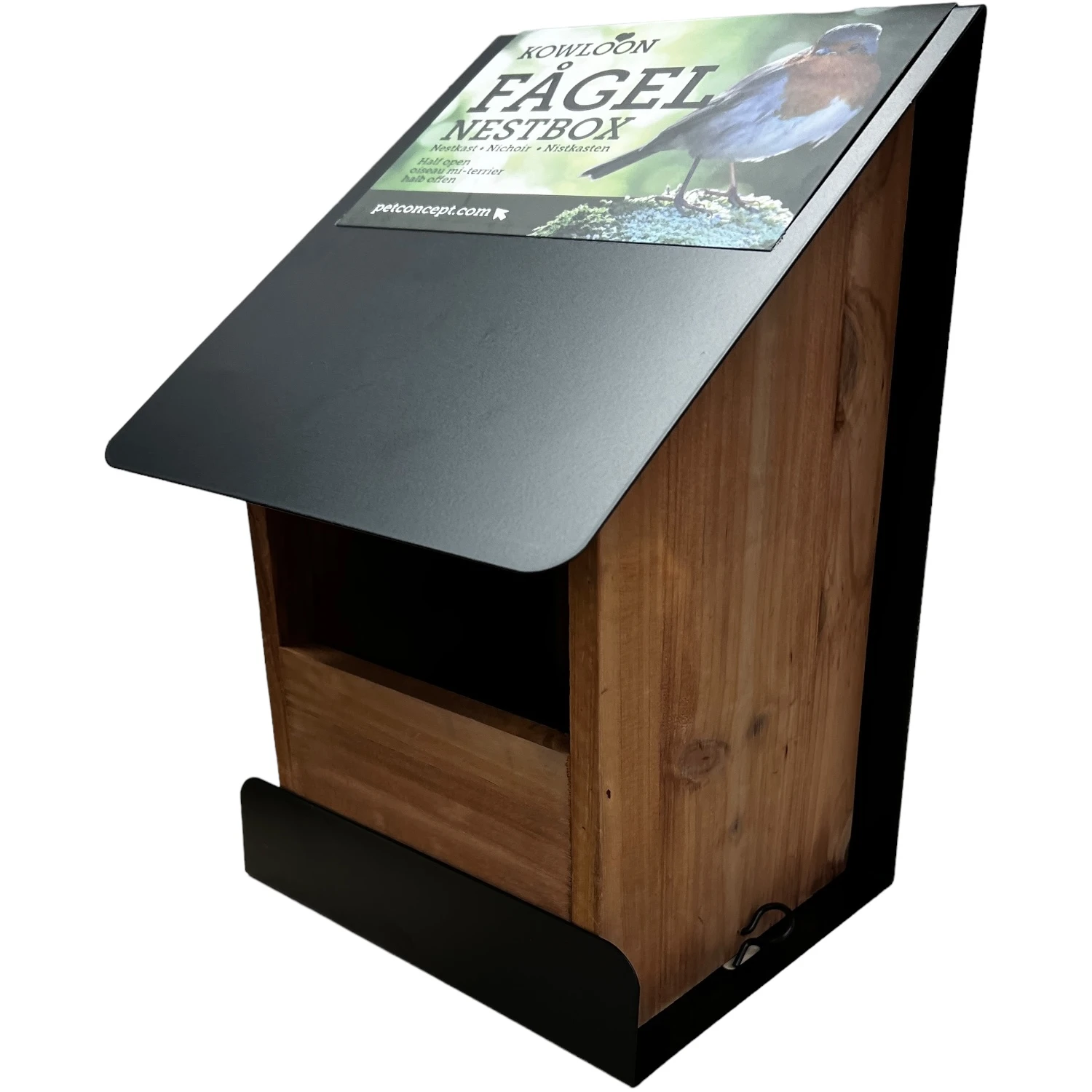Deze degelijke halfhol nestkast van Kowloon is van hout gemaakt, en heeft een dak van plaatstaal en is makelijk schoon te maken.