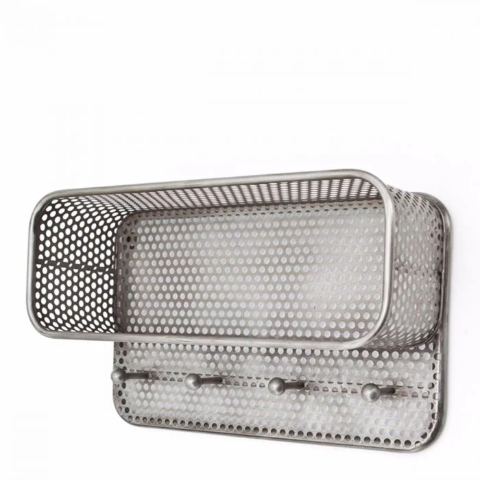 De wandkapstok is gemaakt van metaal en beschikt over een zilvergrijze kleur. De wandkapstok heeft een stoere industriële uitstraling. De wandkapstok beschikt over 4 haken waar jassen en sjaals aan opgehangen kunnen worden. De bovenzijde van de wandkapstok heeft nog een vak waar je bijvoorbeeld mutsen en handschoenen in op kunt bergen.