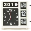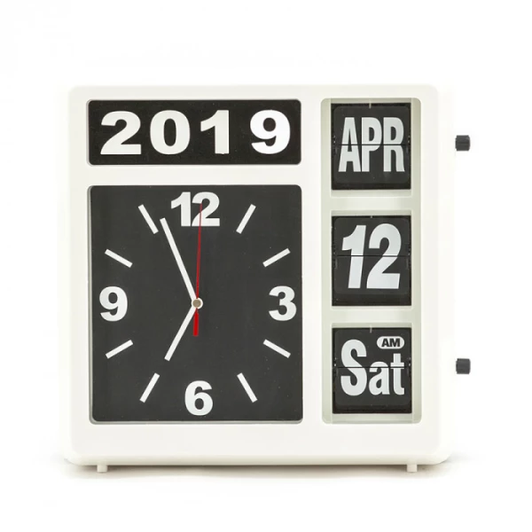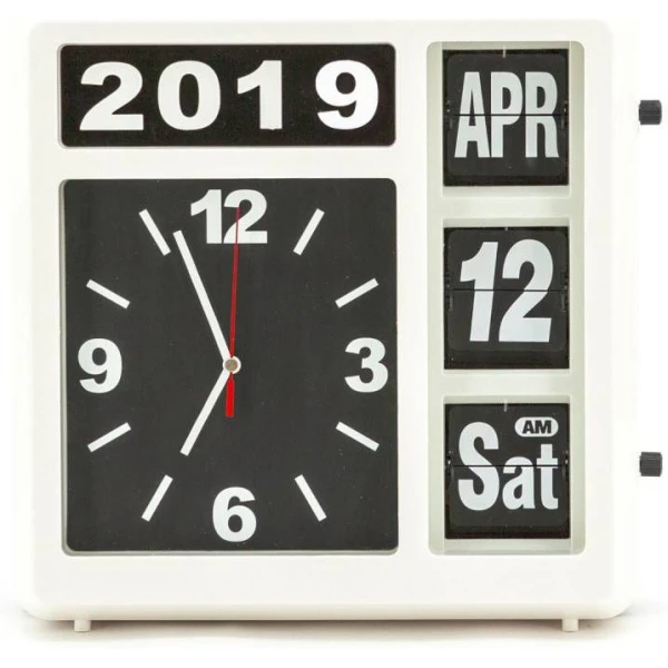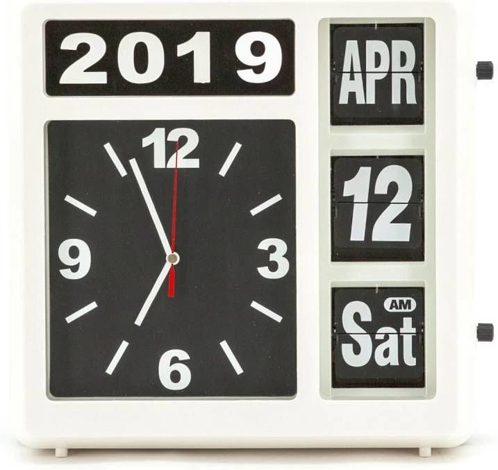De dag in één oogopslag. Dit stoere kubusje geeft je tijd, dag, maand en jaar in één blik. Fraai verwerkt in een strak stramien. De seconde wijzer geeft een kleine colourpop aan het geheel. De data wordt fraai weergegeven door een flipover systeem. Dit hebbeding is ideaal in ons drukke wereldje. Kortom een stoer en krachtig blokje informatie waarmee je de dag goed begint.