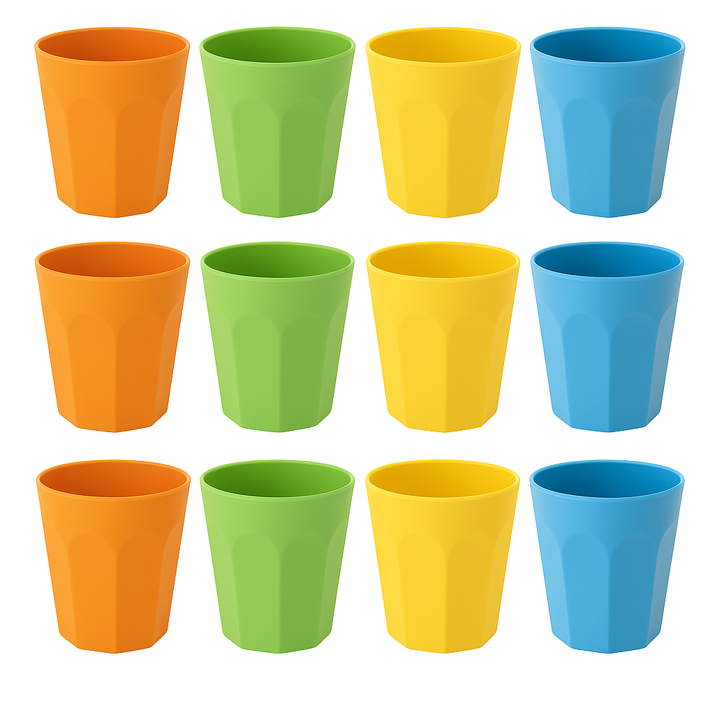 Breng kleur en gemak in huis met deze set van 12 duurzame bekers, bestaande uit 3 gele, 3 oranje, 3 blauwe en 3 groene exemplaren. Gemaakt van stevig, onbreekbaar polypropyleen (kunststof), zijn deze bekers ideaal voor dagelijks gebruik door jong en oud. Met een inhoud van 300 ml zijn ze perfect voor water, sap of andere dranken. Ze zijn lichtgewicht, stapelbaar en vaatwasserbestendig – dus eenvoudig schoon te maken en op te bergen. Geschikt voor binnen én buiten!