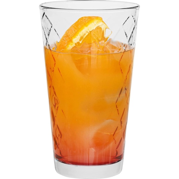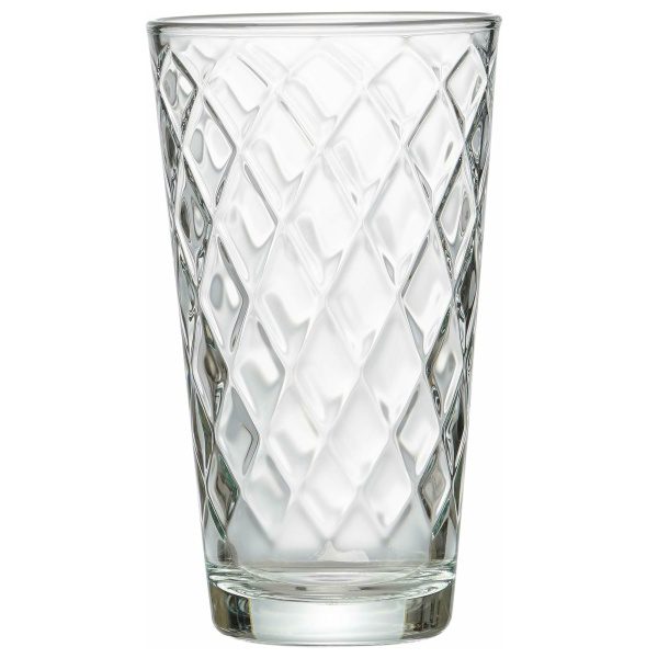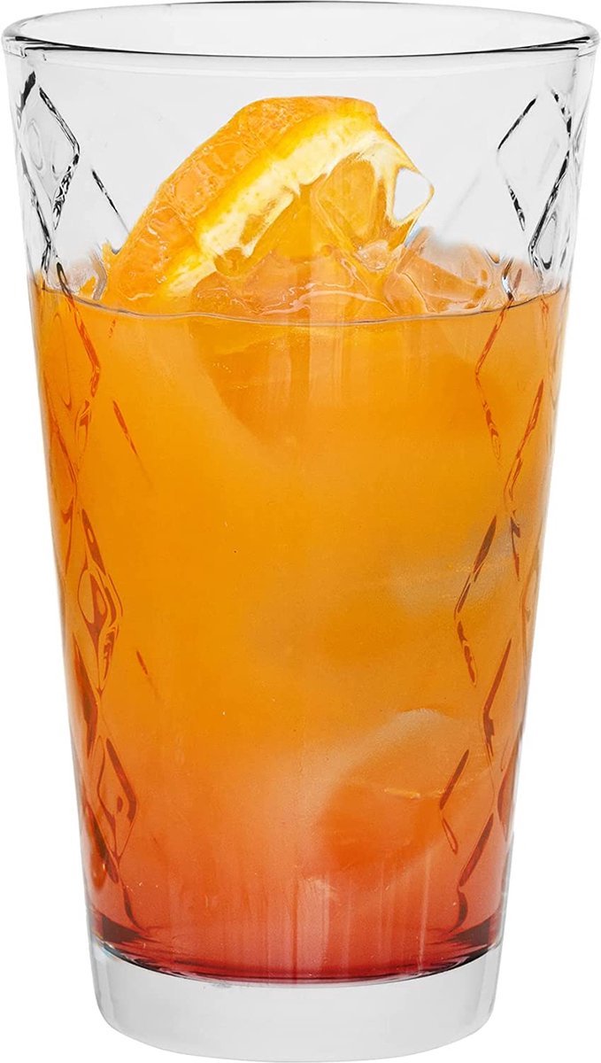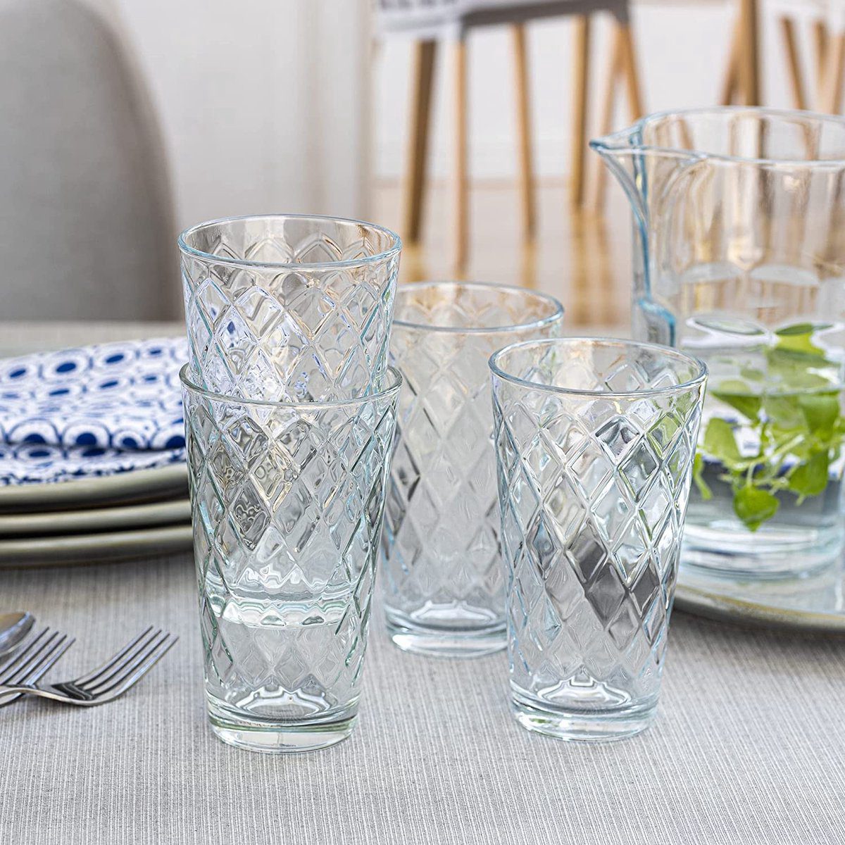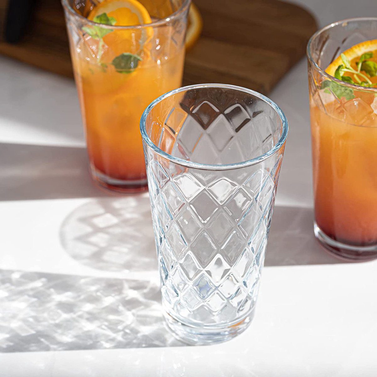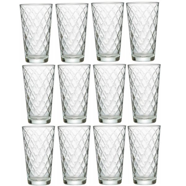 Breng stijl en elegantie op tafel met deze set van 12 longdrinkglazen van 370 ml. De glazen zijn vervaardigd uit hoogwaardig helder glas met een luxe reliëfpatroon, ideaal voor het serveren van frisdrank, cocktails, water of sappen.