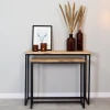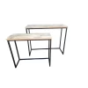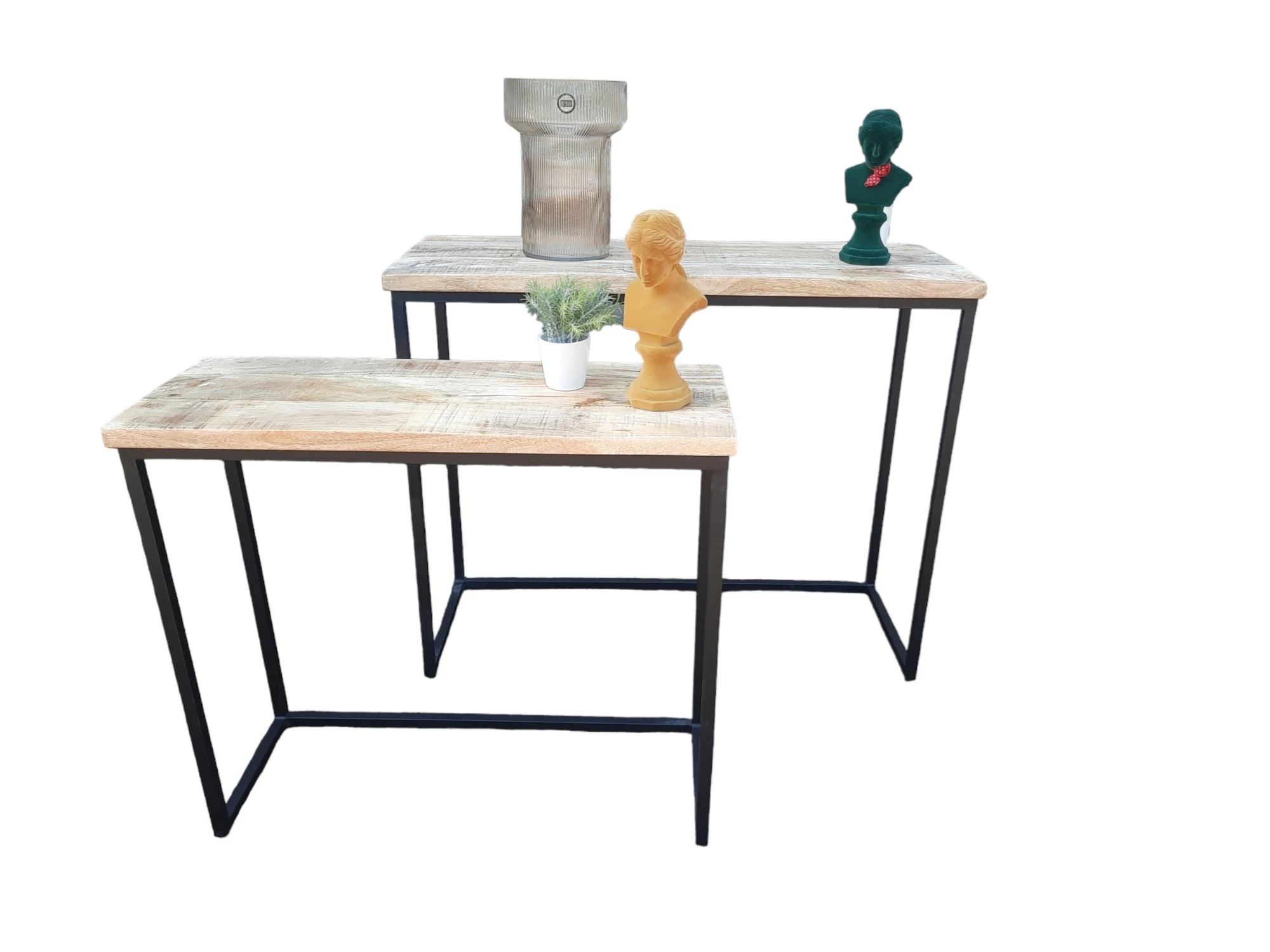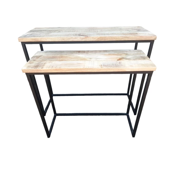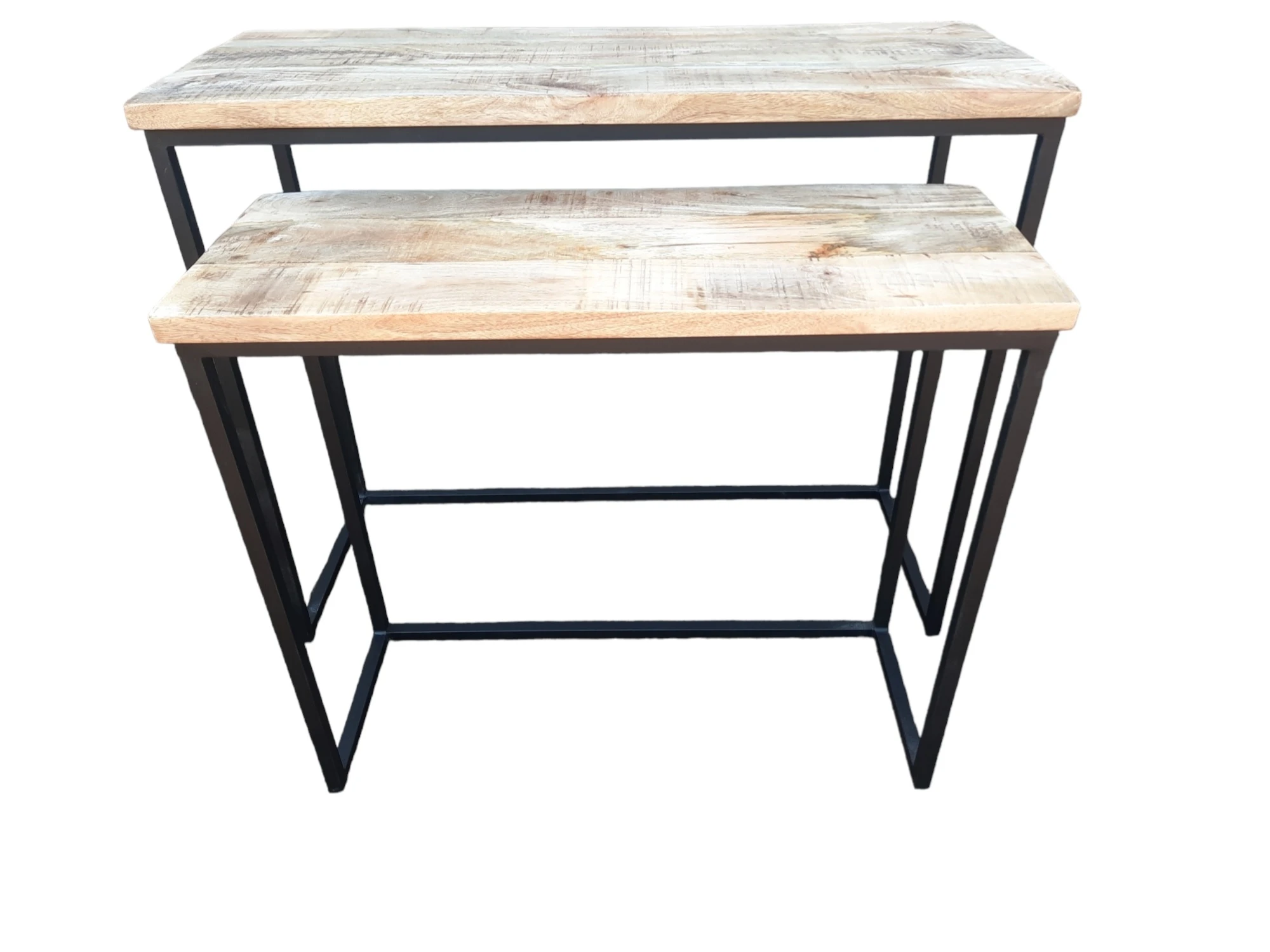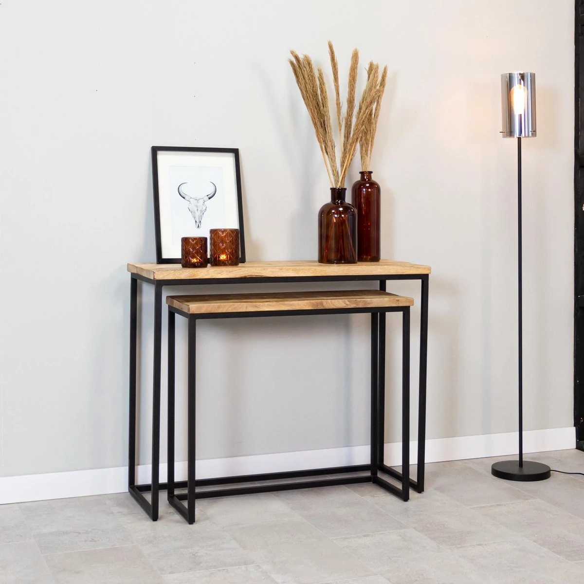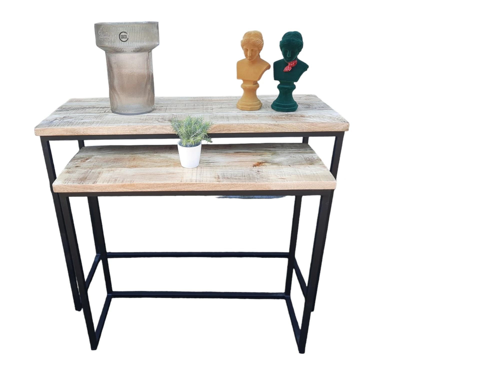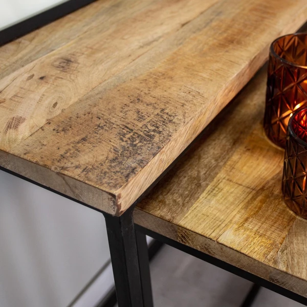 De combinatie met het mangohout geeft deze sidetable set een stoere, industriële uitstraling.