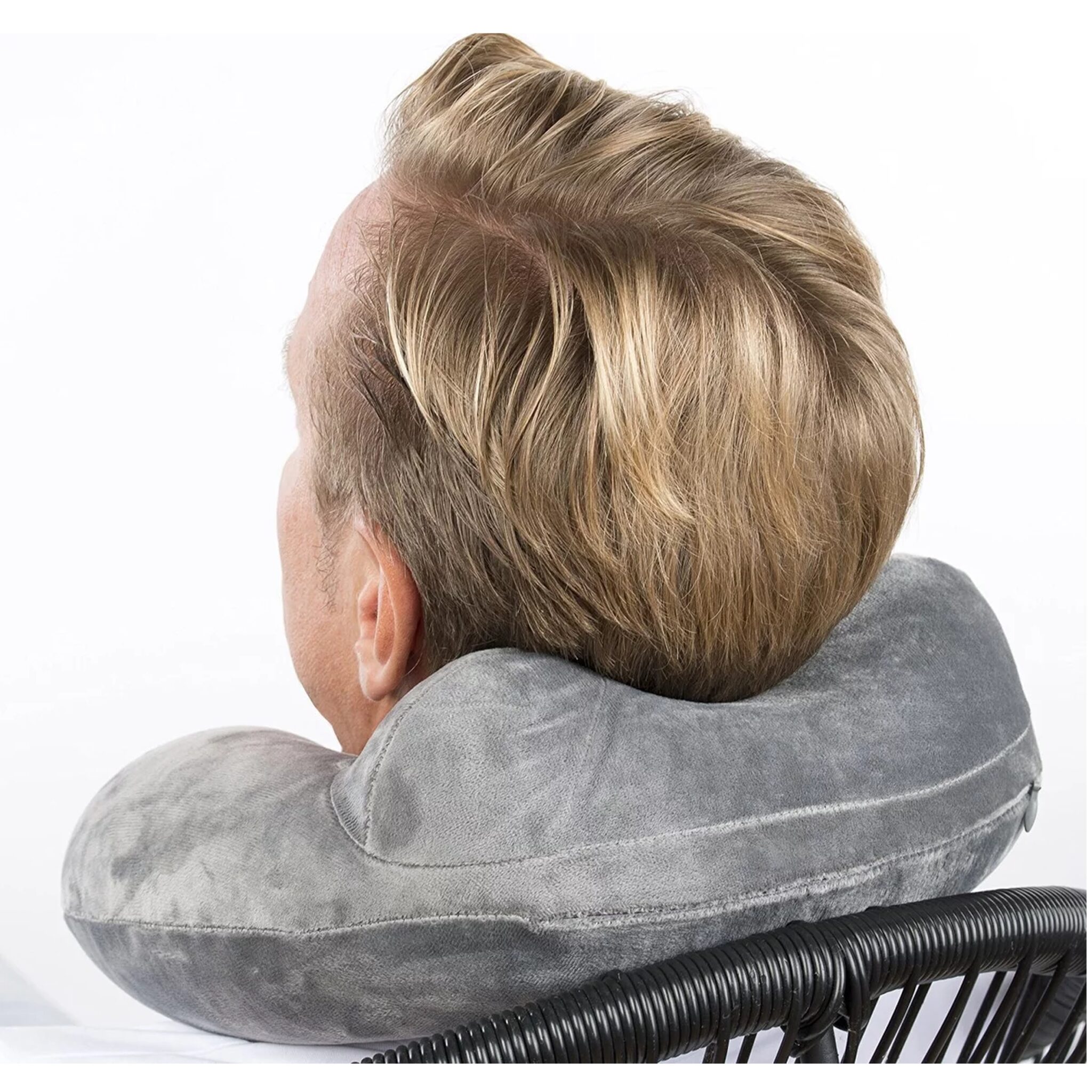 Grijs opblaasbaar reiskussen Premium, dat dankzij de gepatenteerde vorm optimaal ondersteuning biedt aan het hoofd. Dankzij deze ondersteuning worden nek- en hoofdpijn voorkomen. Het kussen is ideaal voor op reis, want dankzij de mogelijkheid om het leeg te laten lopen neemt het vrijwel geen ruimte in beslag in uw bagage.
