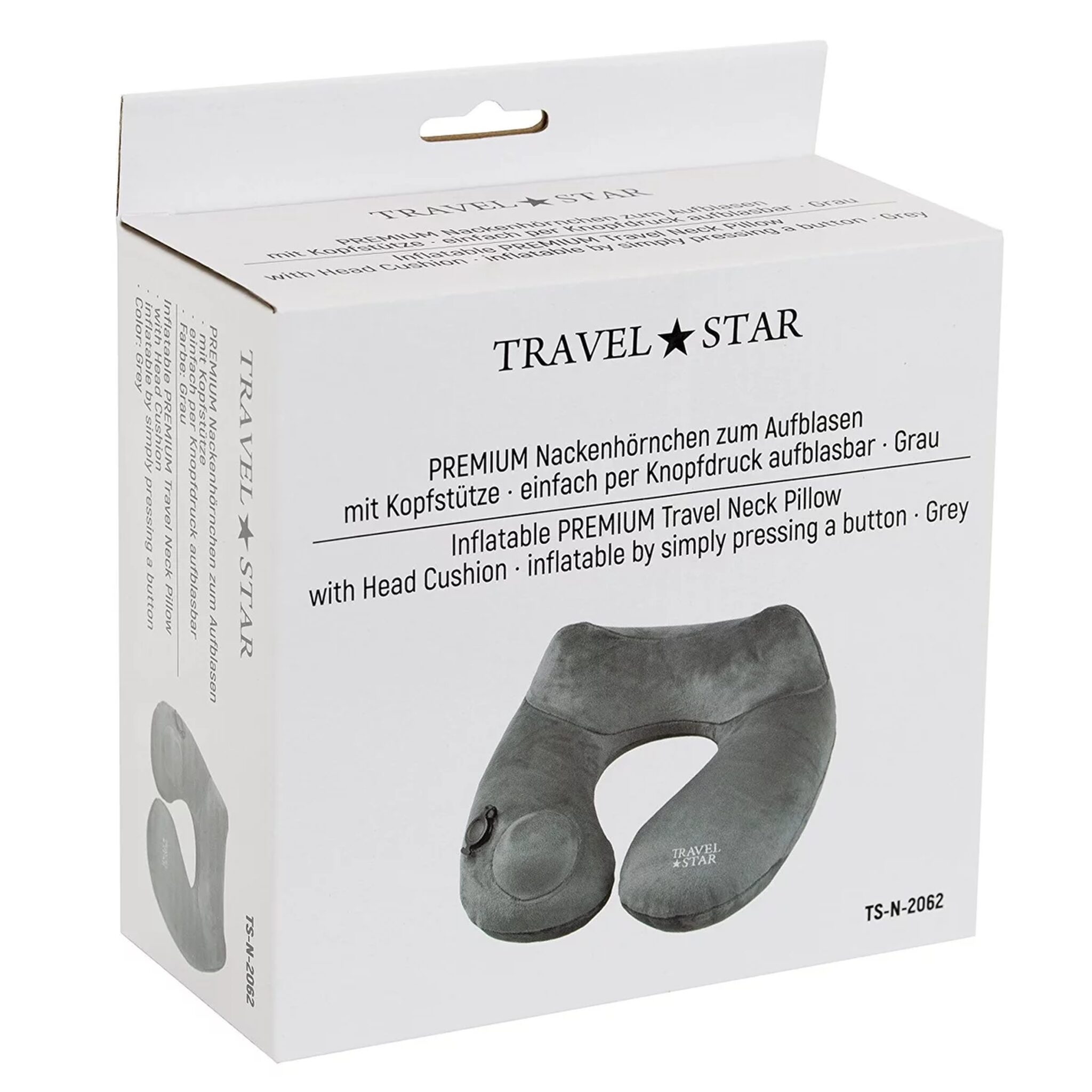 Veilig online shoppen doe je bij ons!Grijs opblaasbaar reiskussen Premium, dat dankzij de gepatenteerde vorm optimaal ondersteuning biedt aan het hoofd.