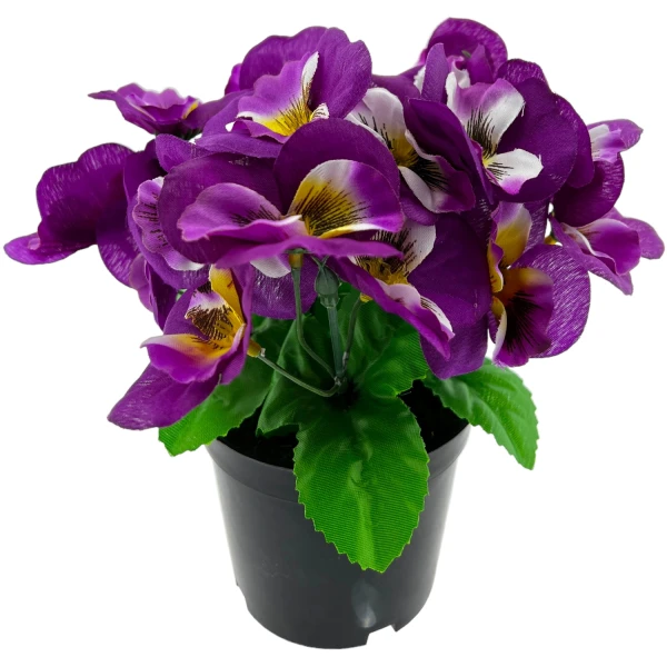 Veilig online shoppen doe je bij ons!Assortiment van 3 kleuren viooltjes, de kunstof viooltjes zitten in een potje van 9 x 9x 8 cm, de totale hoogte is 21 cm.